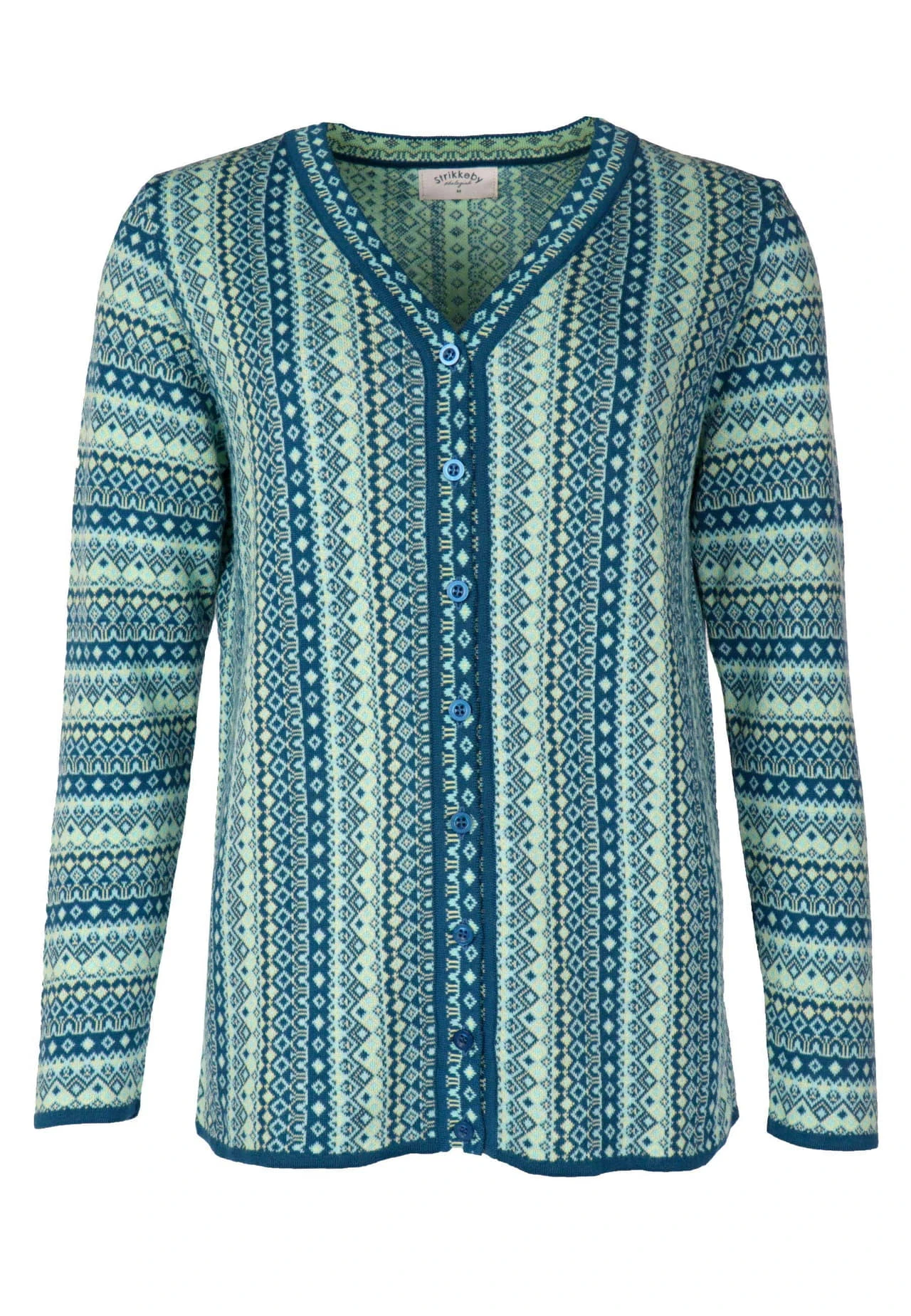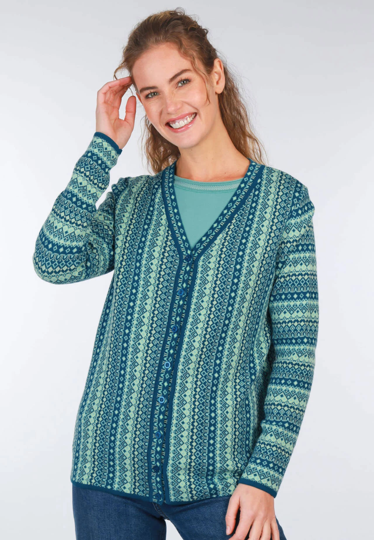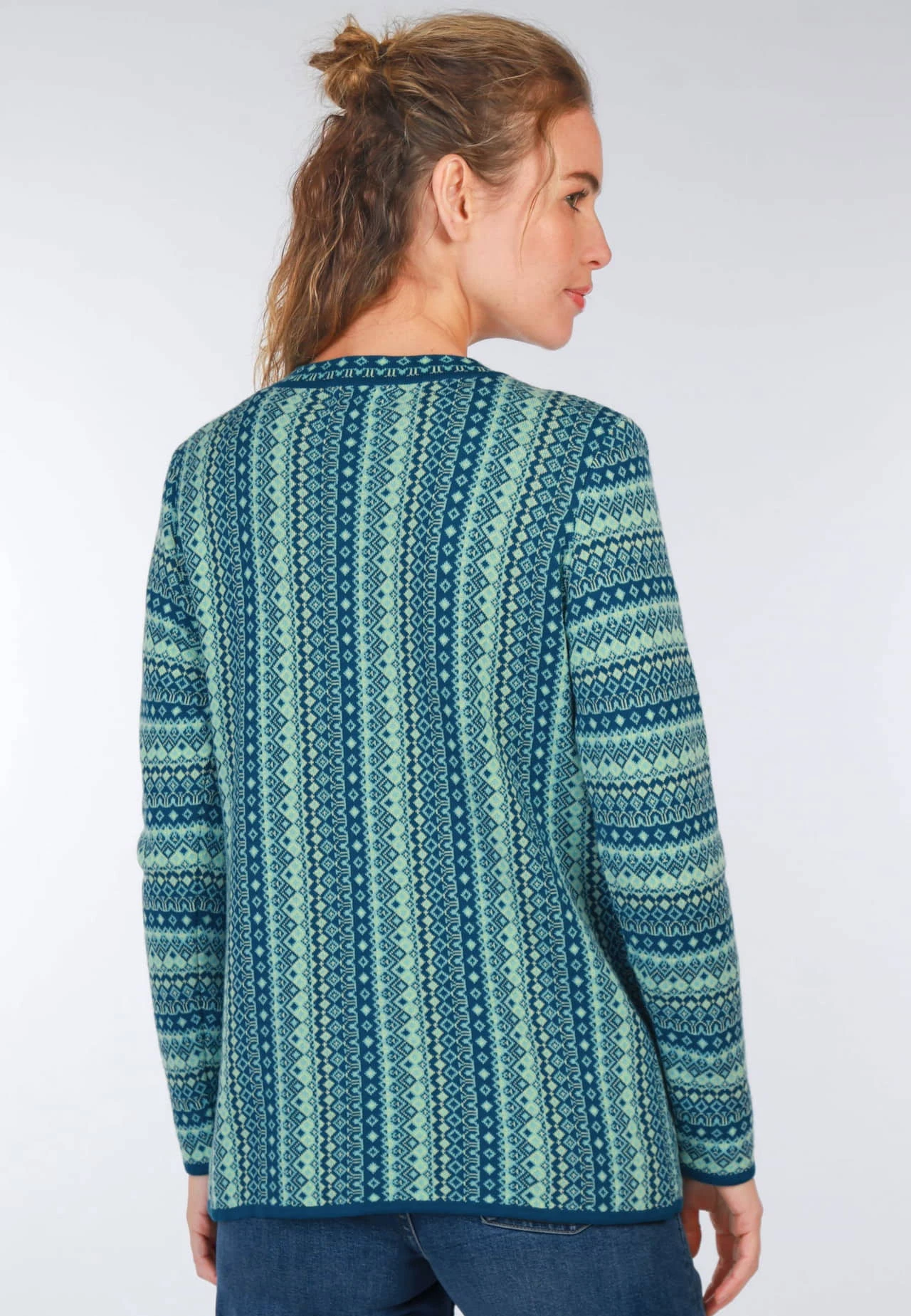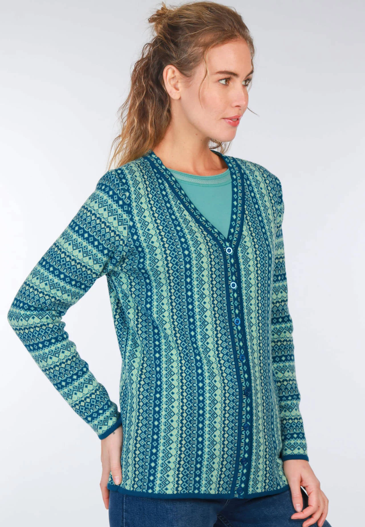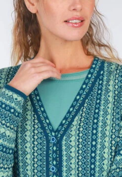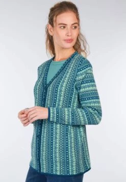 Länge 65cm (M). Unser V-Neck-Cardigan ist ein absolutes Must-Have für jede modebewusste Frau, die auf Nachhaltigkeit setzt. Das farbenfrohe florale Jacquardmuster ist ein Blickfang und sorgt für einen femininen Look. Hergestellt aus 100% Organic Cotton ist sie nicht nur angenehm zu tragen, sondern auch umweltfreundlich produziert. Die lockere Passform und der modische V-Ausschnitt machen diese Strickjacke zum vielseitigen Begleiter für jeden Anlass.