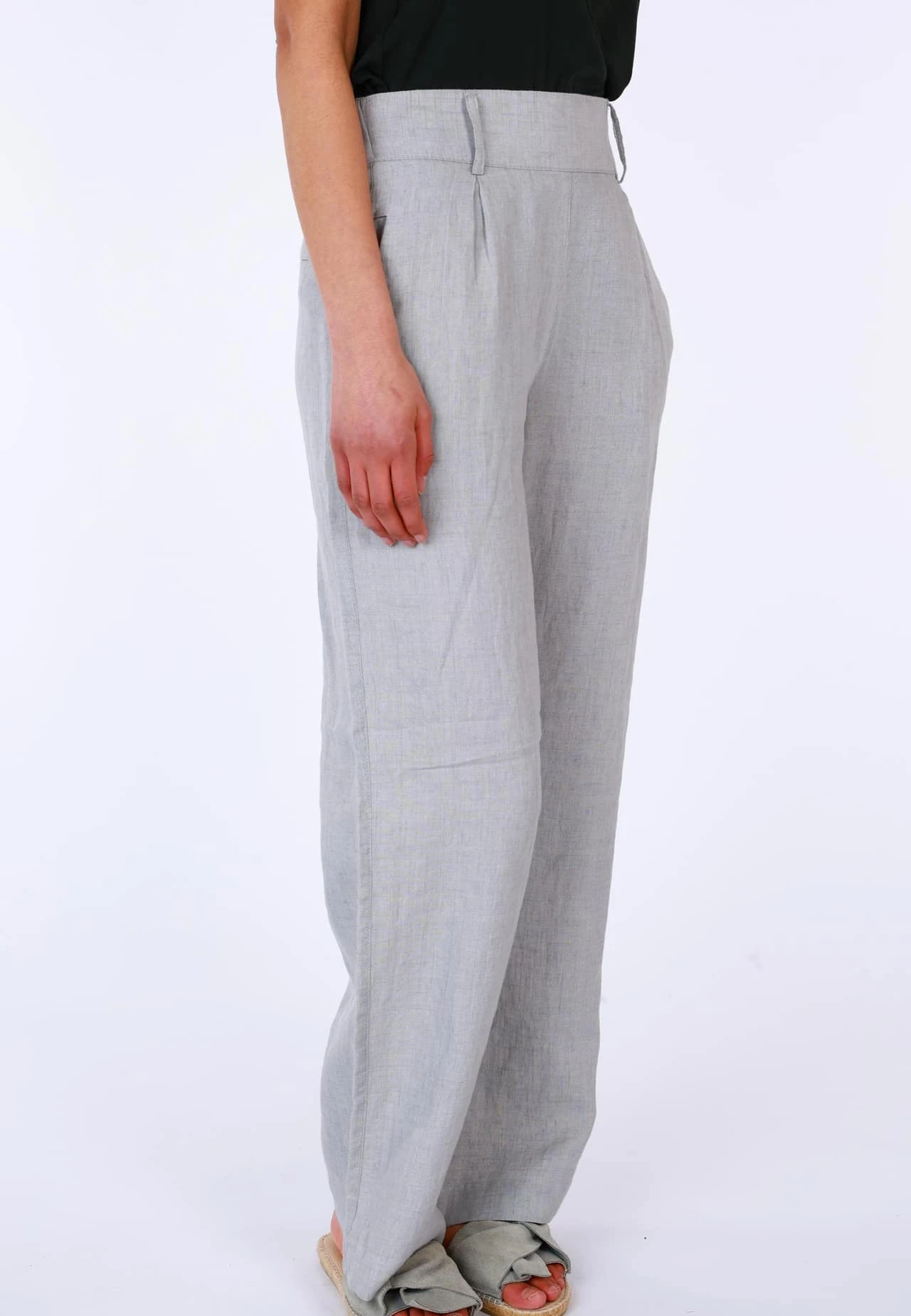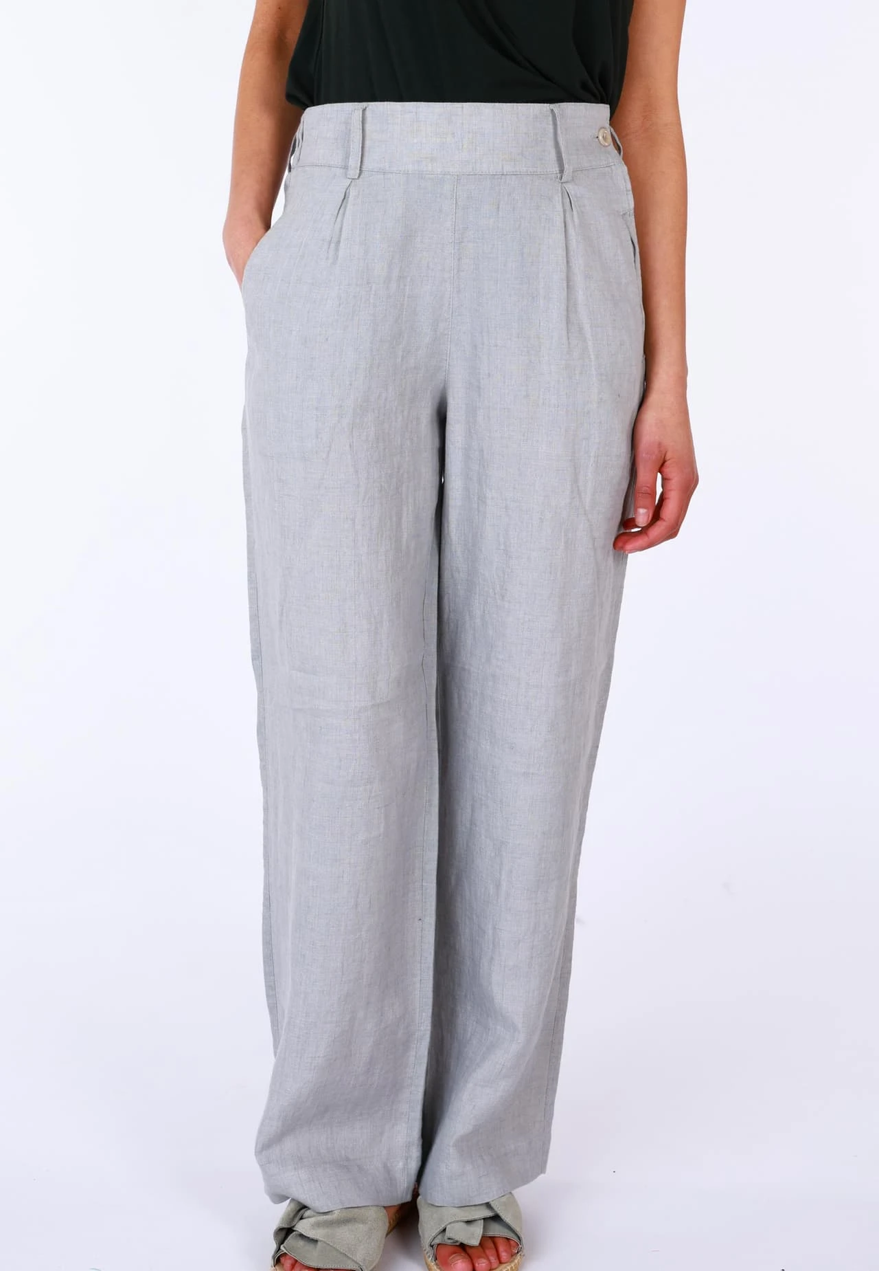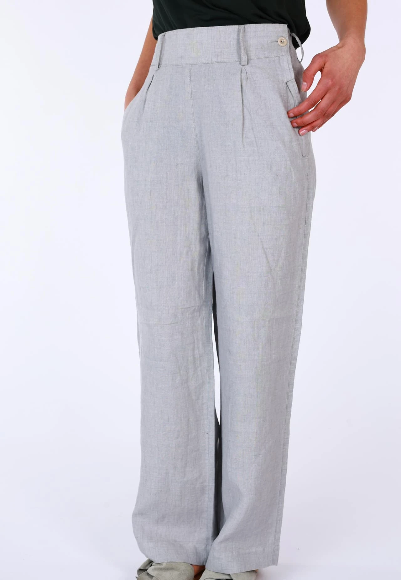 Leinenhose mit hohem Bund, seitlichem Knopf, Gürtelschlaufen, seitlichen Eingrifftaschen. Das Material verspricht ein super angenehmes Tragegefühl, einen perfekten Sitz und Formbeständigkeit für jeden Tag. Durch den hohen Bund zaubert sie eine feminine Sillhouette – klassisch und vielseitig zu kombinieren macht es Grietje zum idealen Style für jede Gelegenheit.