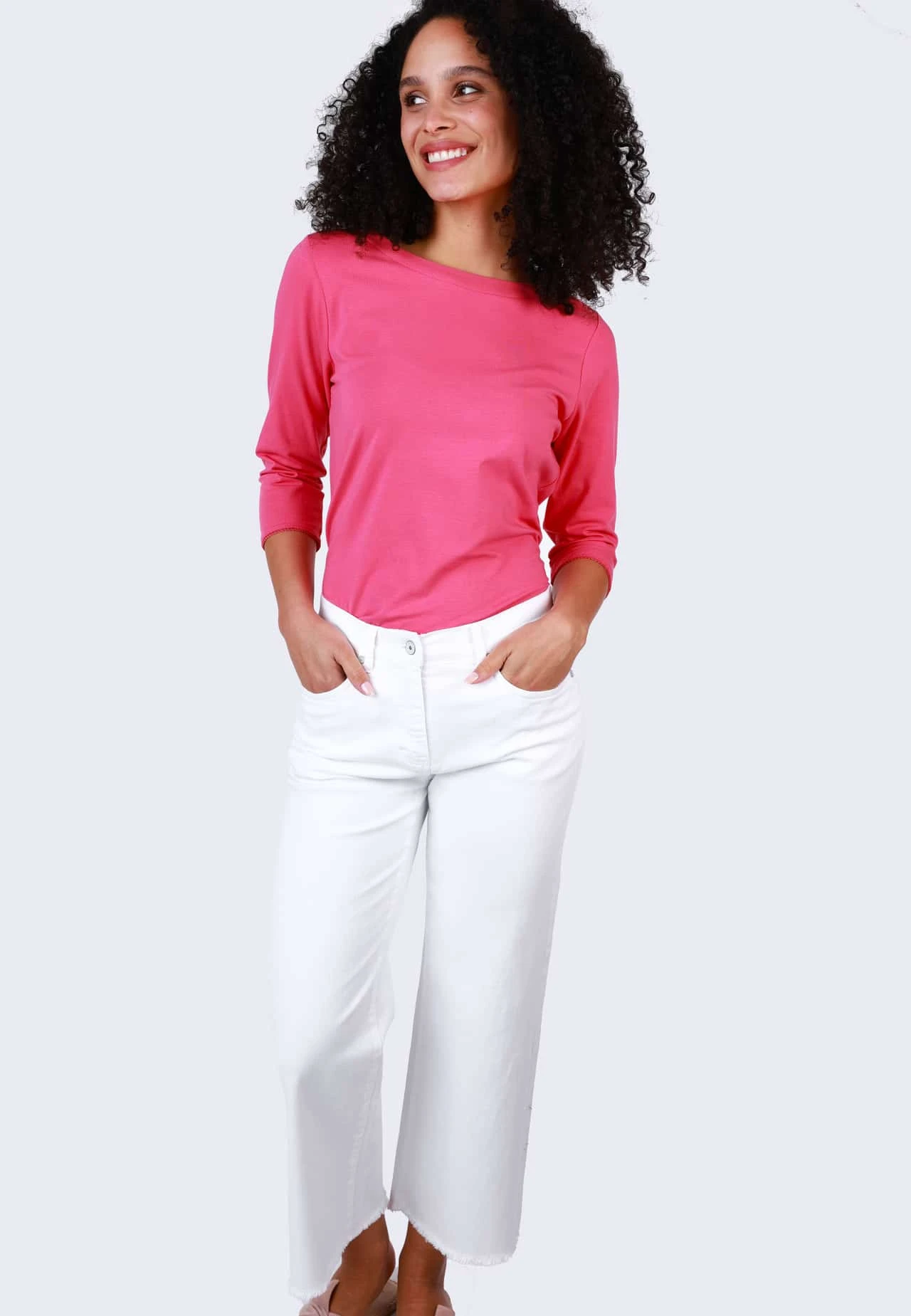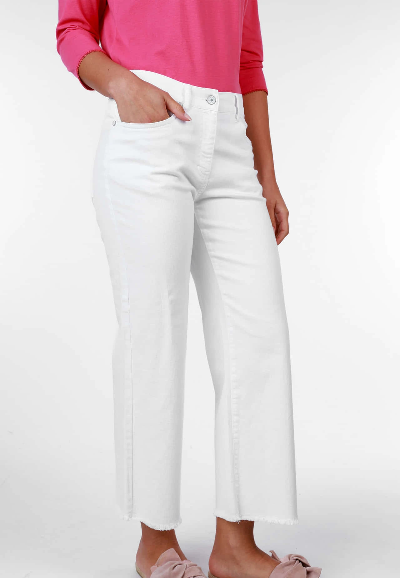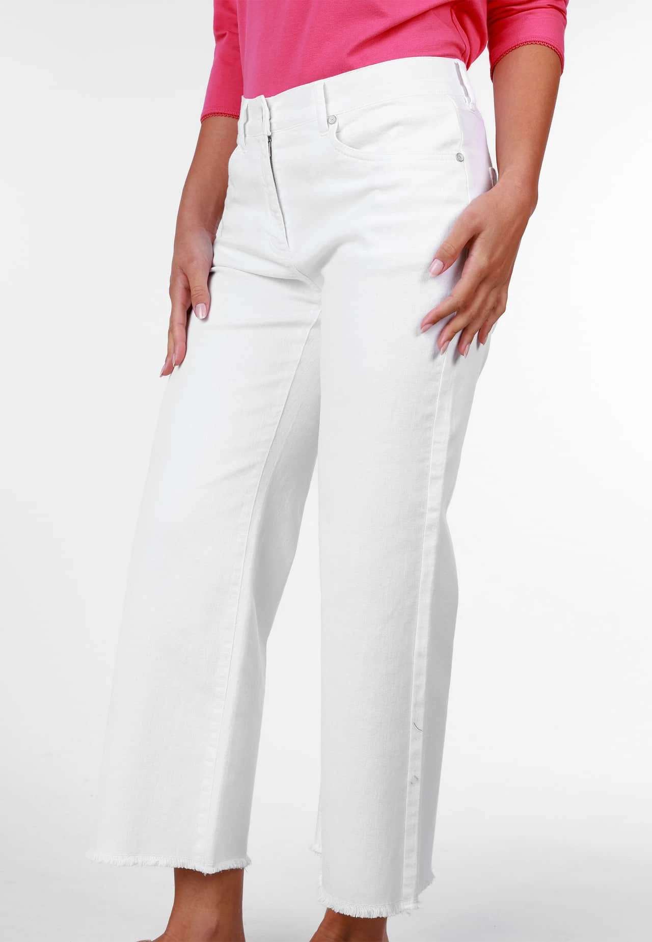 Schlichte Hose mit normaler Bundhöhe, Gürtelschlaufen, Eingrifftaschen und aufgesetzten Gesäßtaschen. Der Materialmix aus Baumwolle und Elasthan verspricht ein super angenehmes Tragegefühl, einen perfekten Sitz und Formbeständigkeit für jeden Tag. Das Bein mit verkürzter Länge verleihen der Trägerin einen sportlichen Look und lässt sich ideal zu Sneakern oder Sandalen als perfektes Sommer Outfit stylen.
