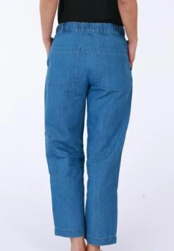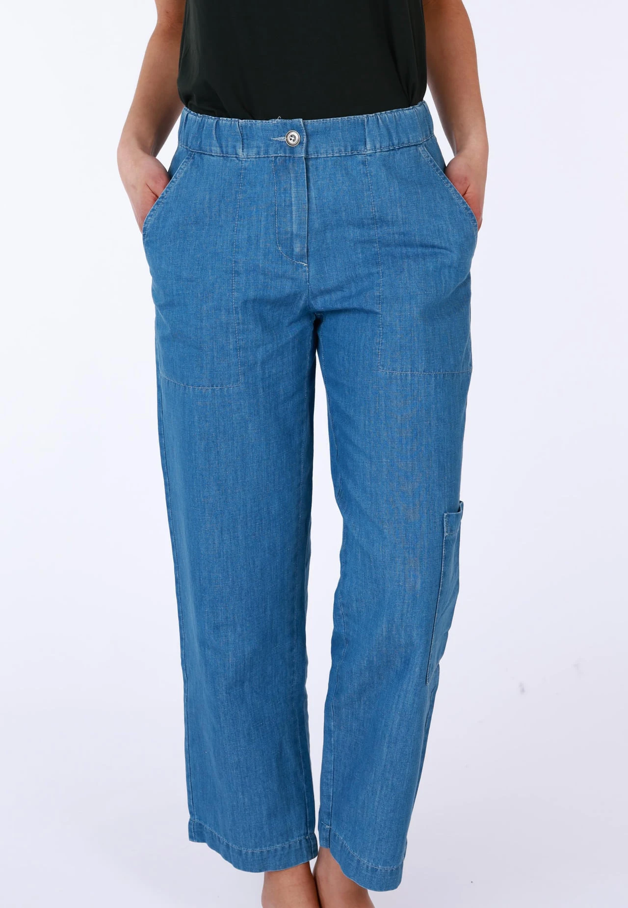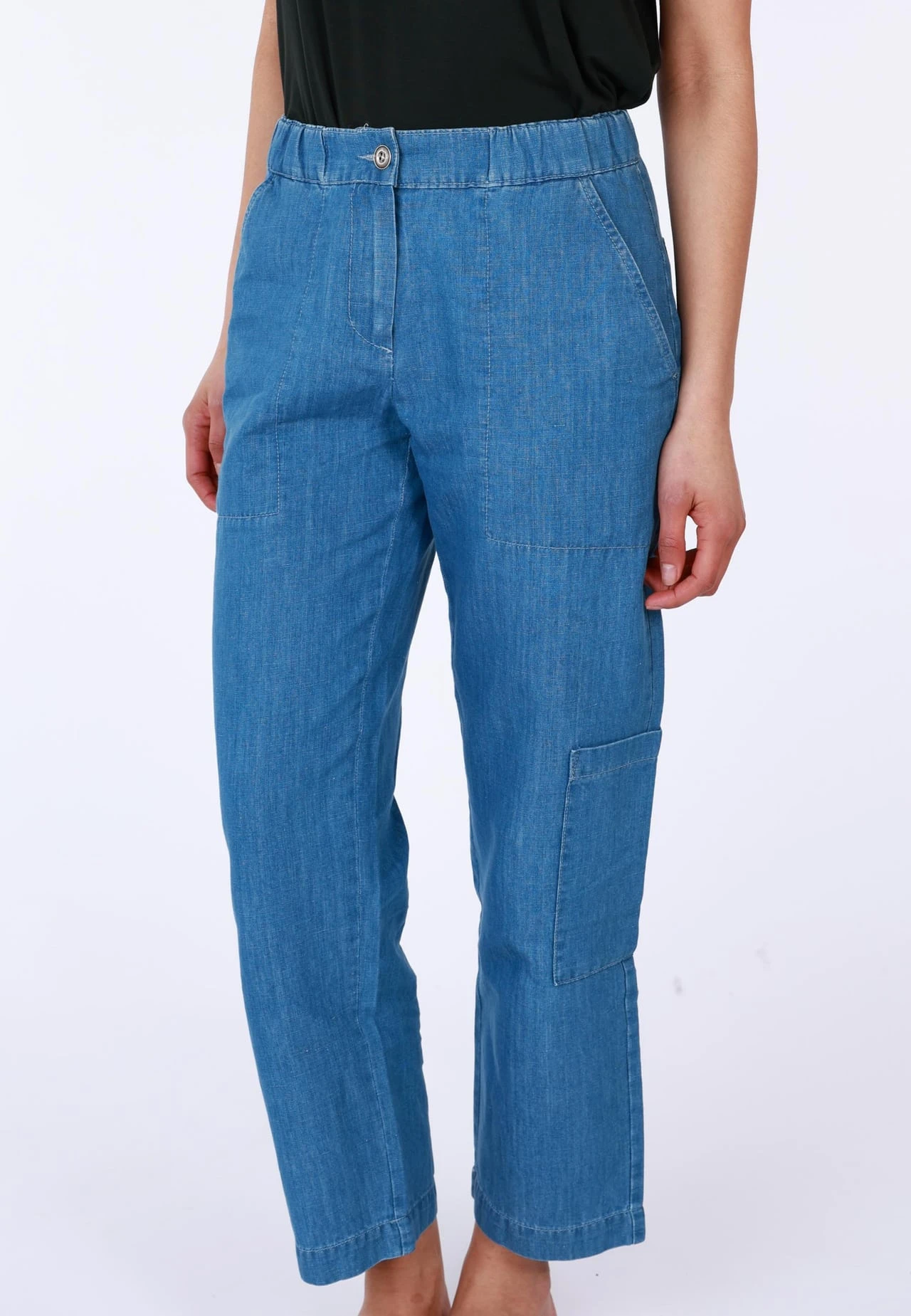 Lässige Hose mit hohem elastischem Bund und aufgesetzten Gesäß-, sowie seitlichen Eingrifftaschen. Der Materialmix aus Baumwolle und Leinen verspricht ein super angenehmes Tragegefühl. Das gerade geschnittene Bein und die knöchelumspielende Länge verleihen der Trägerin einen sportlichen Look.