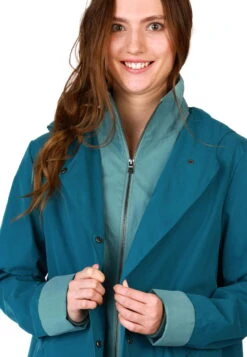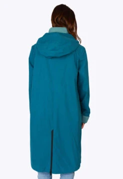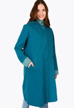 Dieser schöne mittellange Mantel Riekje aus einer leichten und weichen Bio-Baumwollmischung überzeugt mit femininer Sportivität und besonderen Tragekomfort durch den Reißverschluss im unteren Rückenteil. Der farblich abgesetze Krageneinsatz ist ein echter Hingucker im Alltag. Durch die wasserabweisenden Eigenschaften bleibt man auch bei einem Sommerregen trocken. Wasserabweisend bis 3000mm Wassersäule.