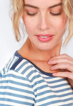 Gesamtllänge Größe (M) 62.Dieses sportlich-maritime Shirt verfügt über einen farblich abgesetzten Rundhalsausschnitt und 3/4-Ärmel. Mit seinem klassischen Streifenmuster und der bequemen Passform ist das Shirt der ideale Begleiter für jeden Tag.