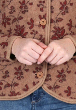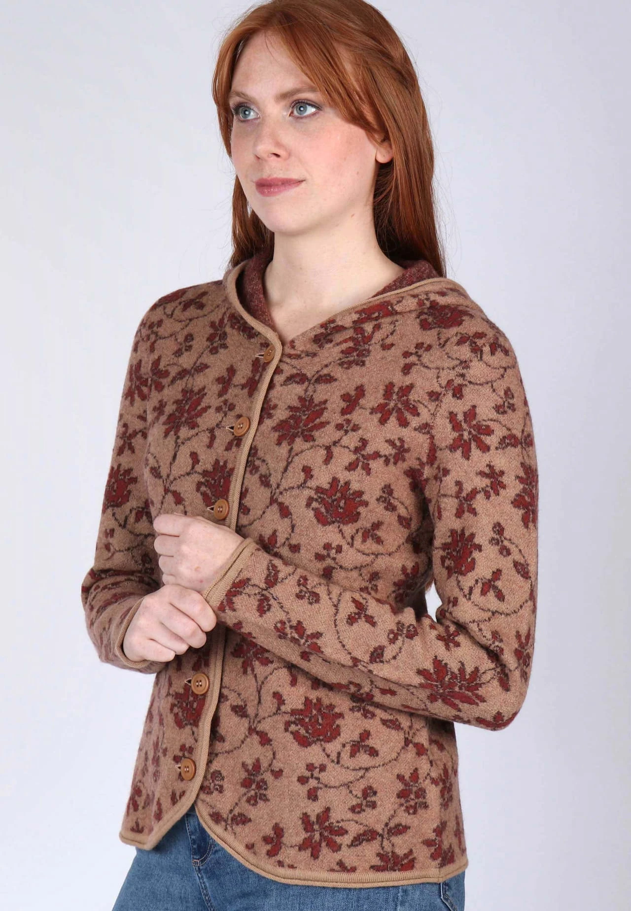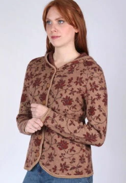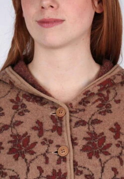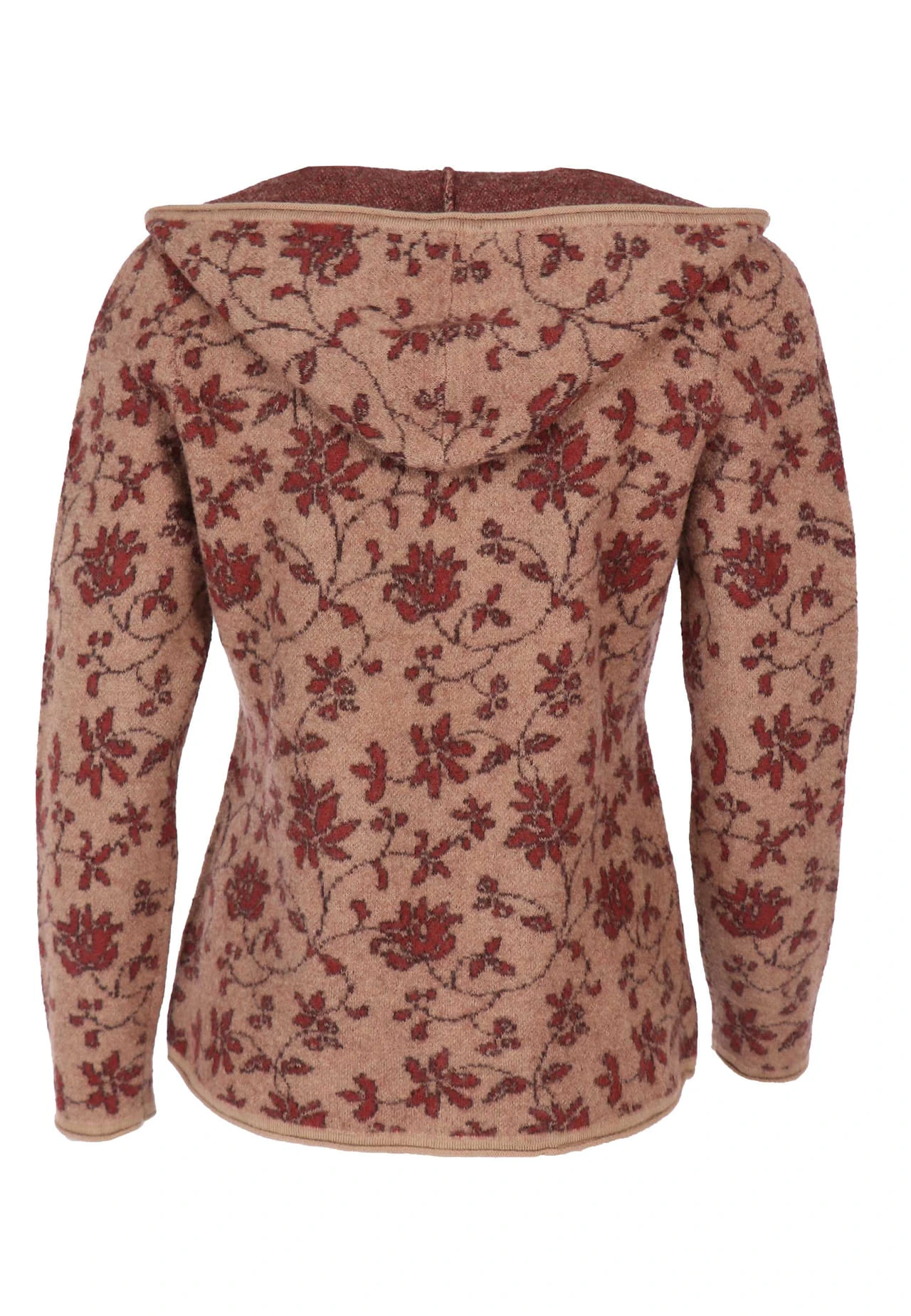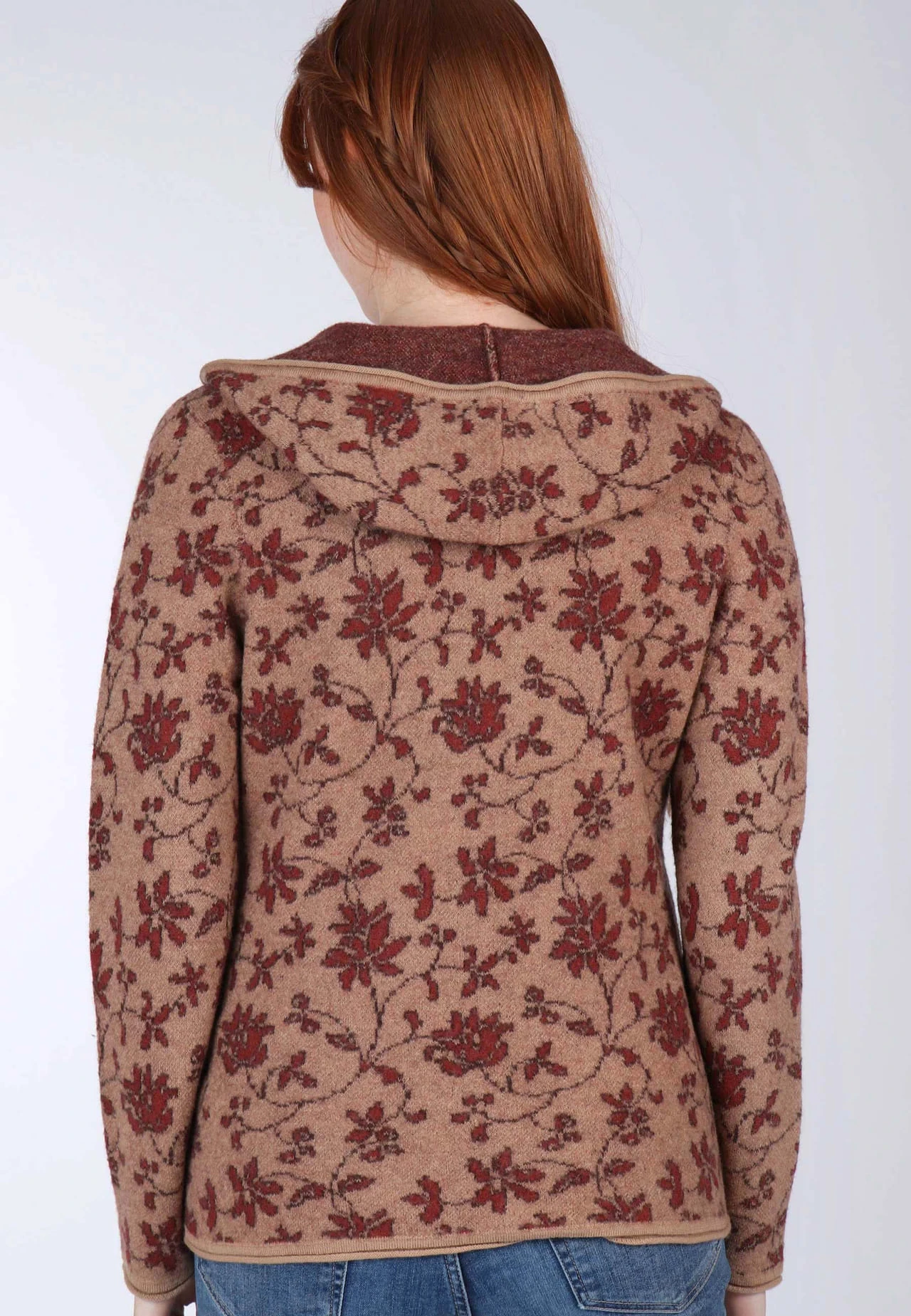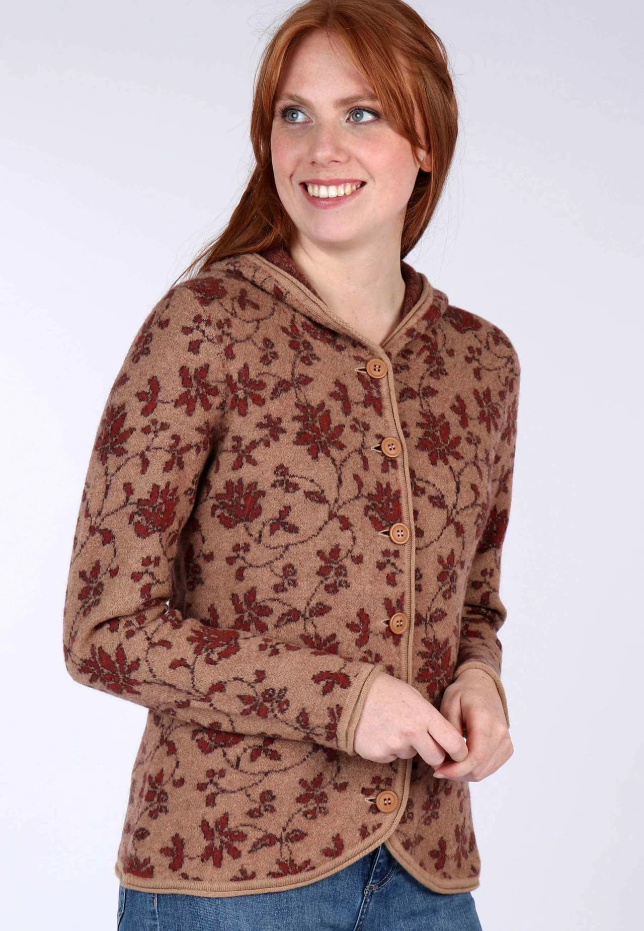 Gesamtlänge 64 cm bei Größe M. Diese Strickjacke, mit floralem Jacquardmuster ist ein gemütlicher und stylischer Begleiter für diesen Herbst. Die Kapuze und die Knopfleiste sind weitere praktische Details. Die verwendete Merino Wolle hält kuschelig warm und macht sie zu einem echten Lieblingsstück.