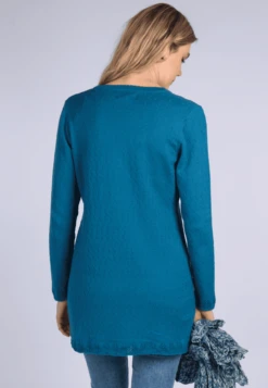 Gesamtlänge 77 cm bei Größe M. Diese Strickjacke ist mit einem filigranen Zopfmuster gearbeitet. Der Style Angela ist ein echter Sorgenfri Klassiker und macht jeden romantisch-femininen Look komplett.