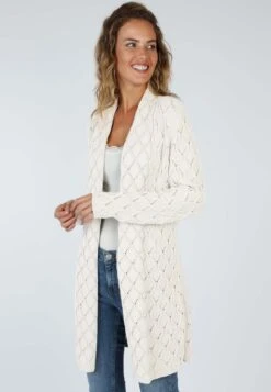 Länge 86cm (M). Klassisch-sportiver Schalkragen-Cardigan mit aufwändigem Cablemuster. Optimaler Tragekomfort bietet die verwendete weiche Baumwolle. Die erstklassige Verarbeitung macht diesen Long-Cardigan zu einem echten Lieblingsstück.
