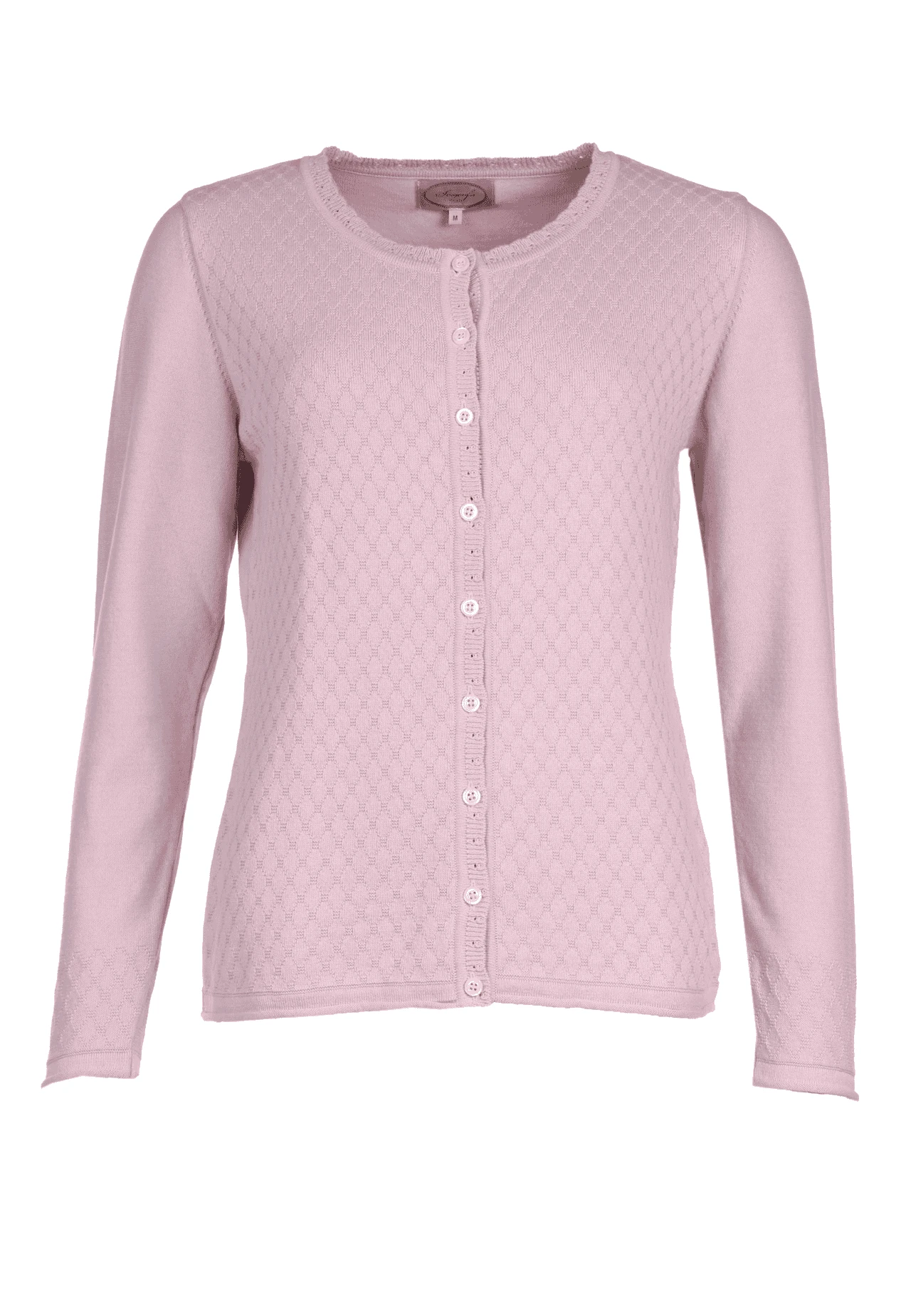 Gesamtlänge 59 cm bei Größe M. Diese Rundhals-Strickjacke hat ein zartes Strickmuster und unterstricht als perfekte Ergänzung zu Kleidern und Röcken den femininen Look.