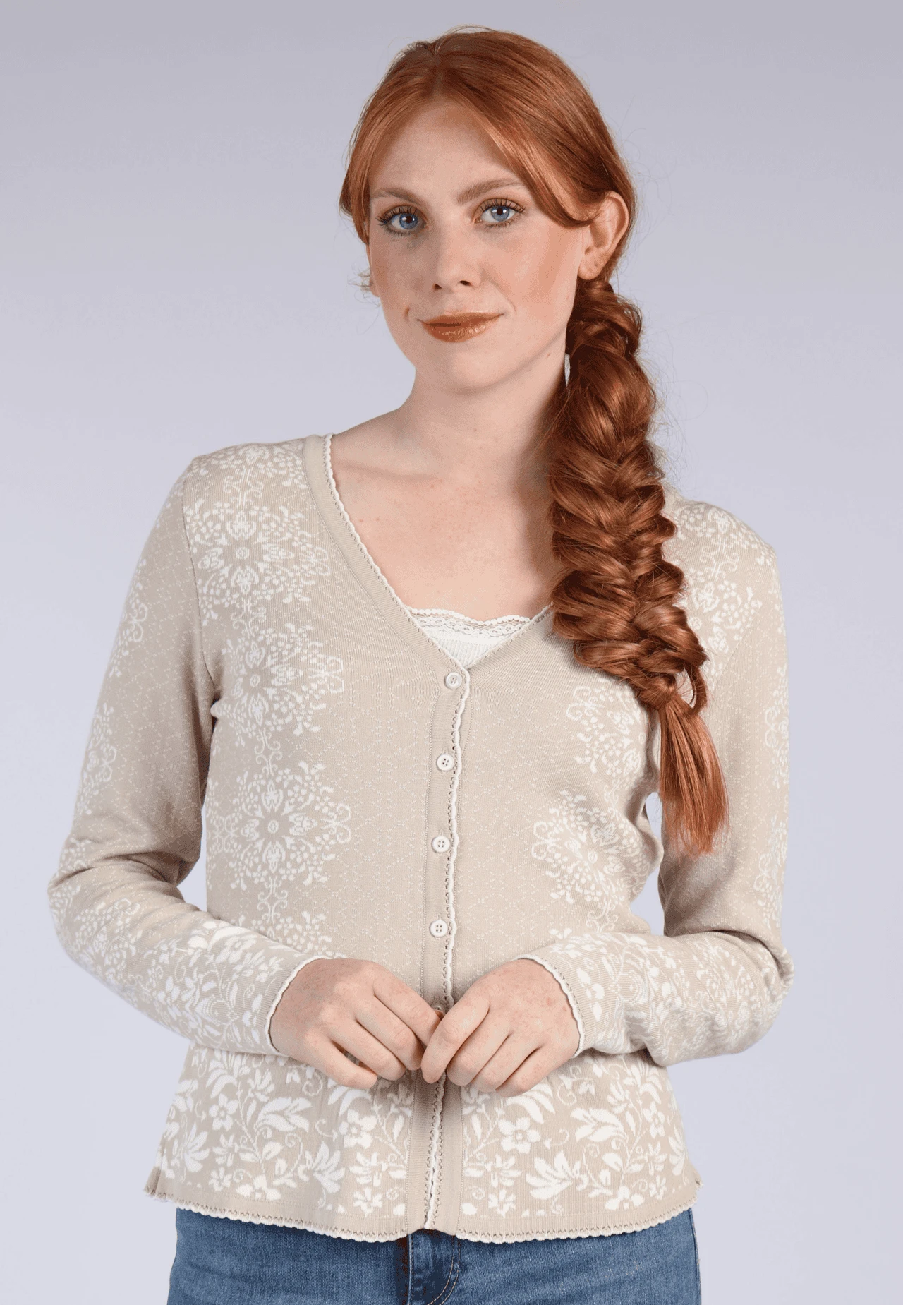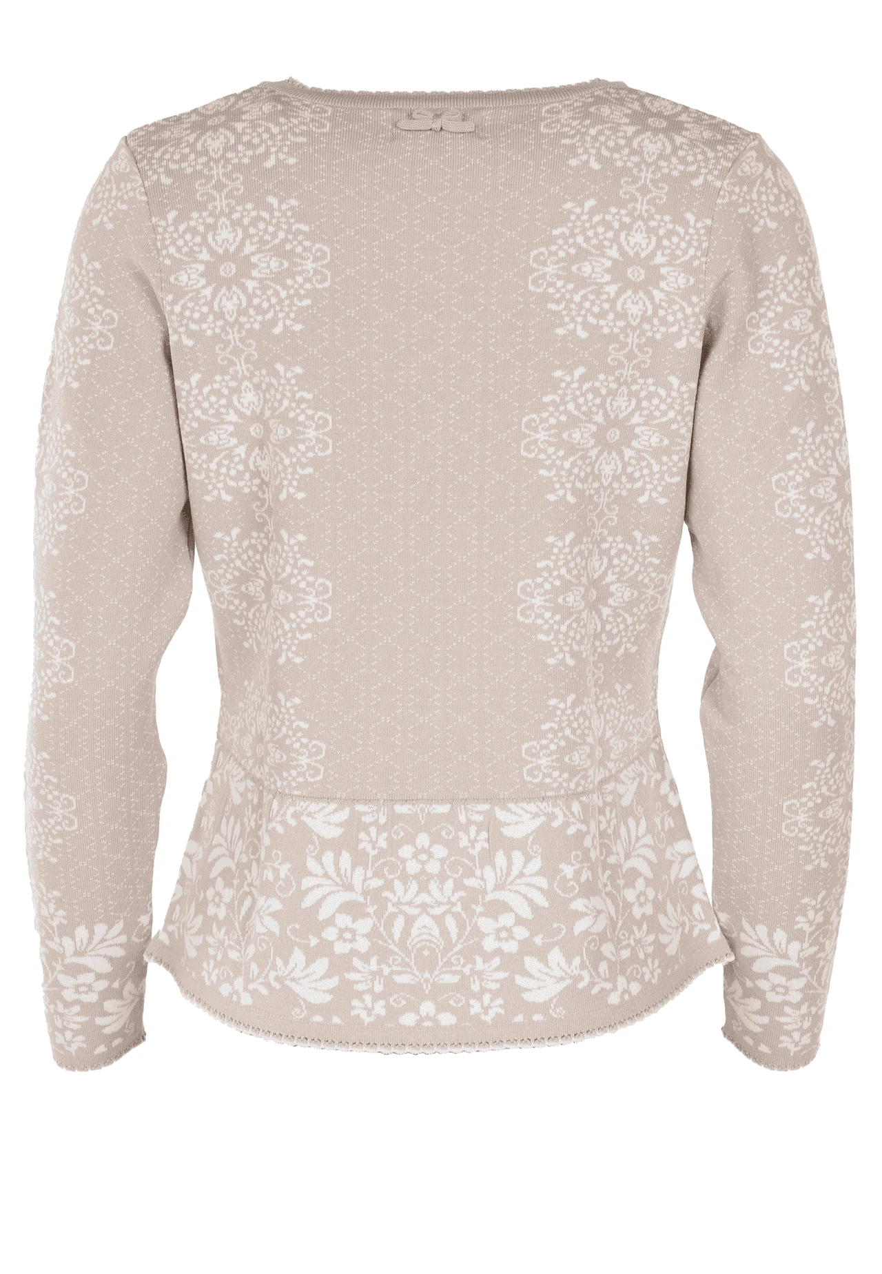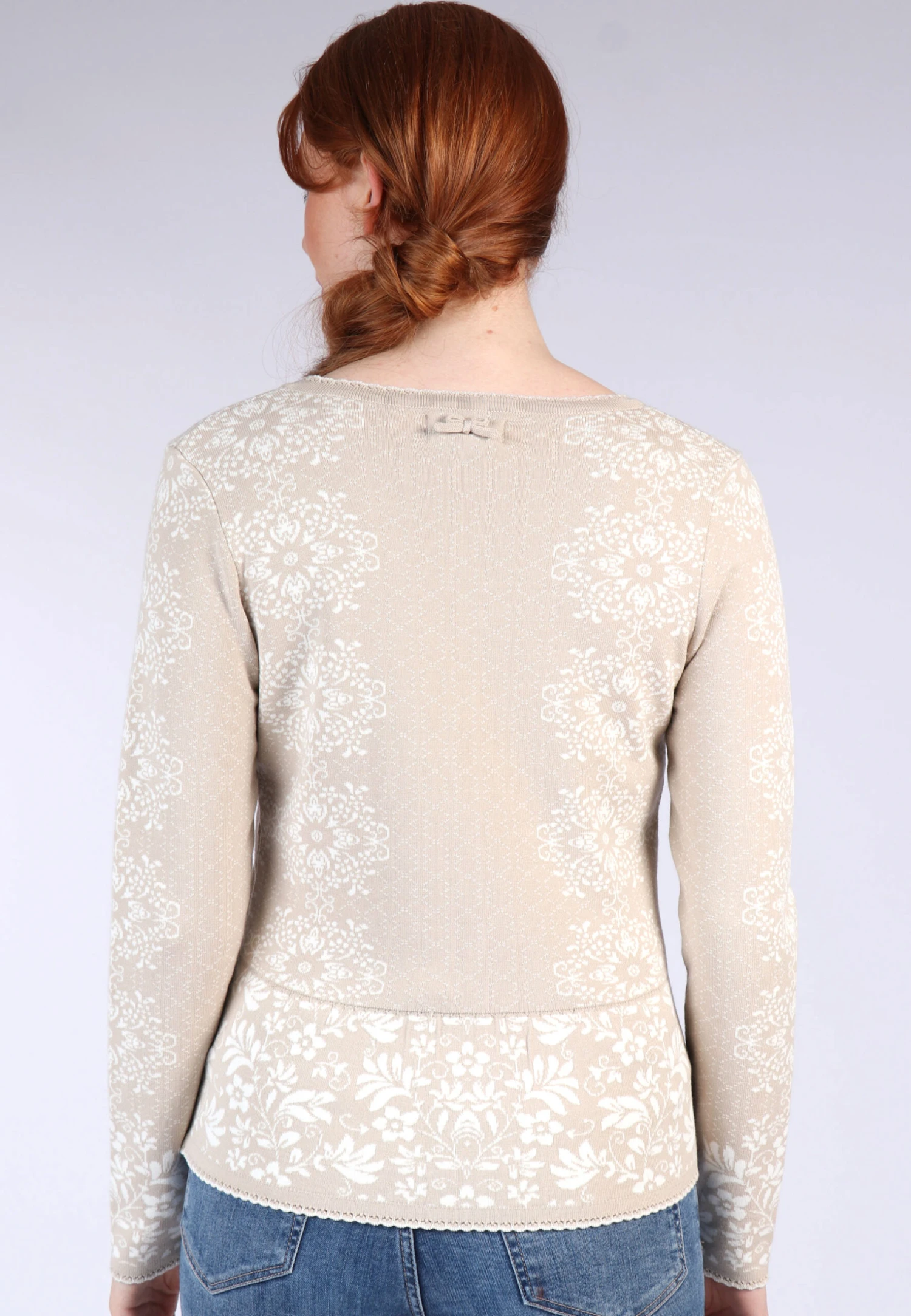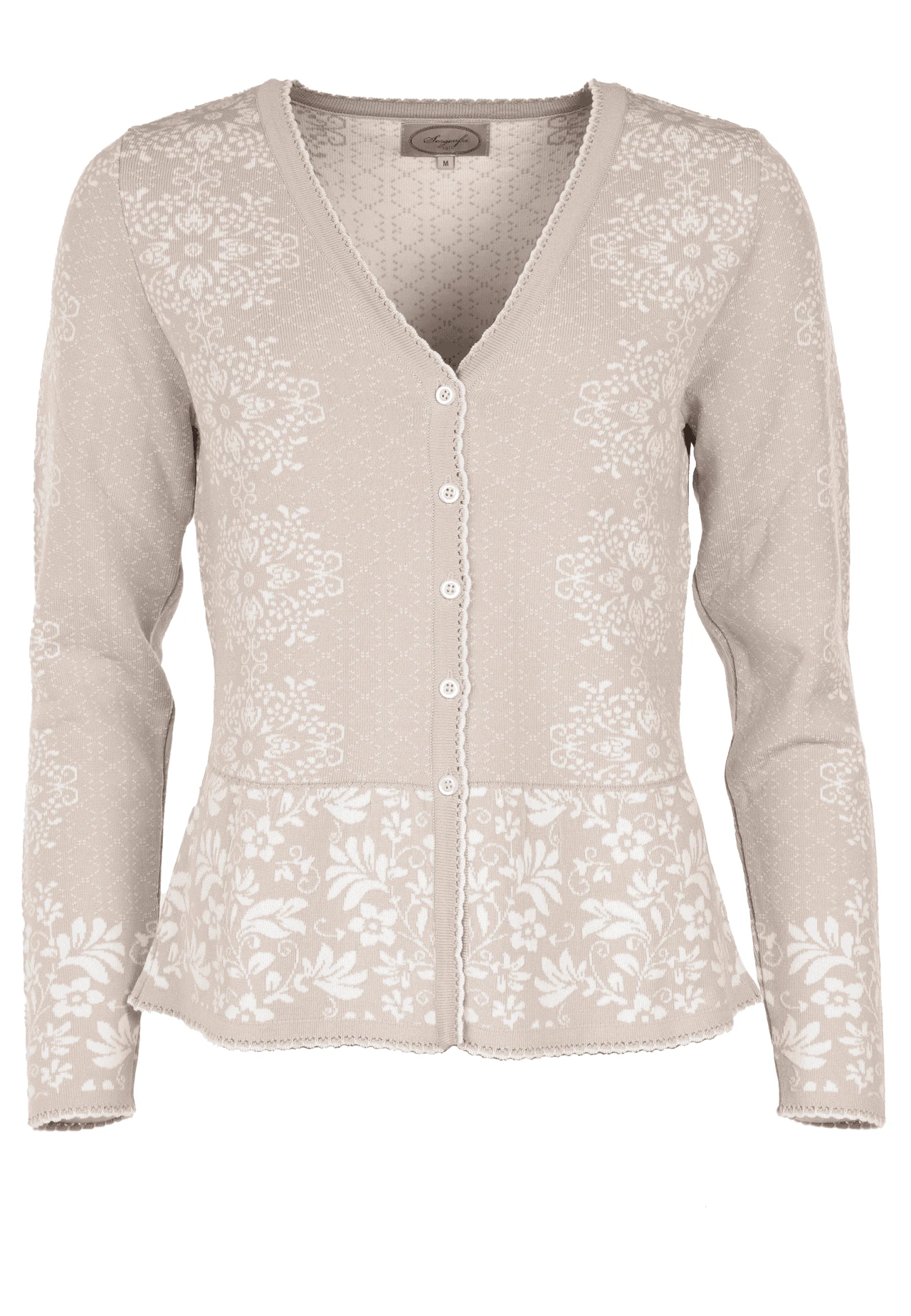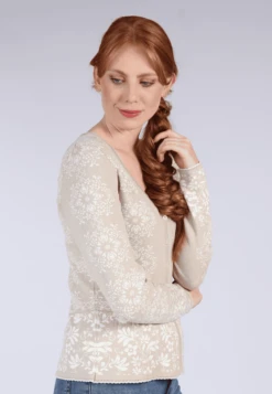 Gesamtlänge 58cm bei Größe M. Diese Strickjacke ist mit einem floralen Jacquard-Blumenmuster gearbeitet und macht Lust auf den Frühling. Getragen zu Kleidern, Röcken und Jeans unterstreicht der Style Lindara den romantischen Look.