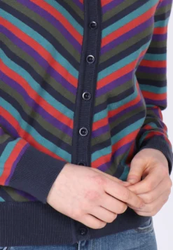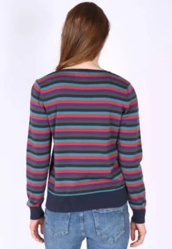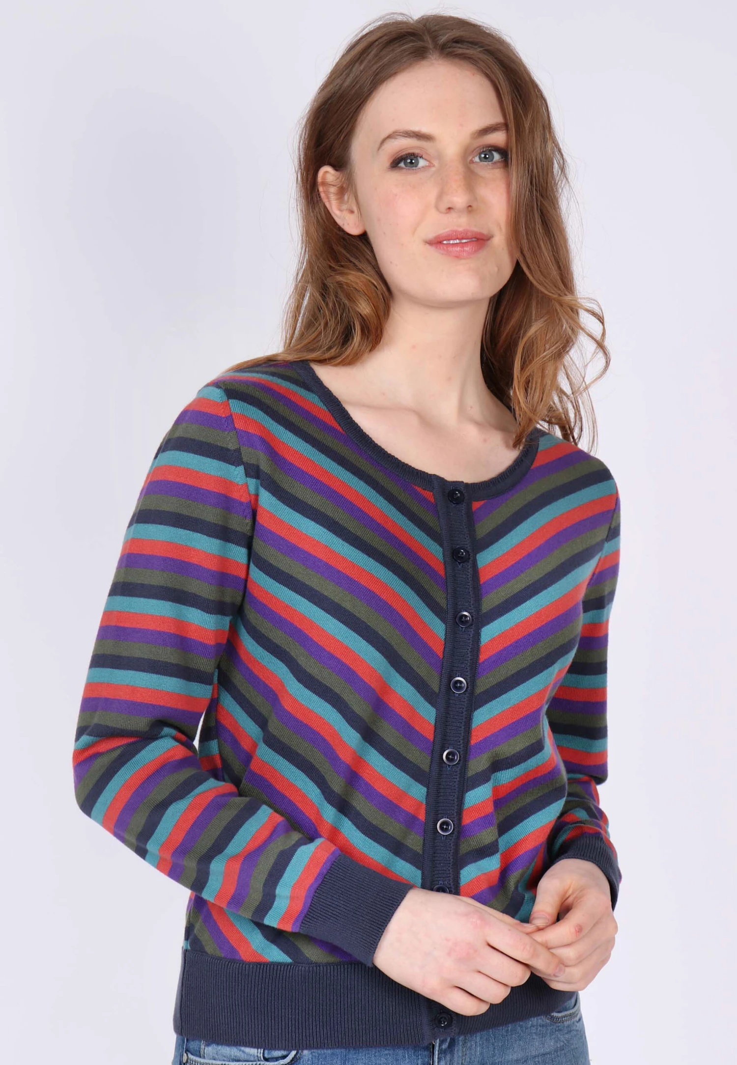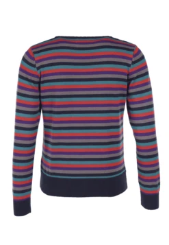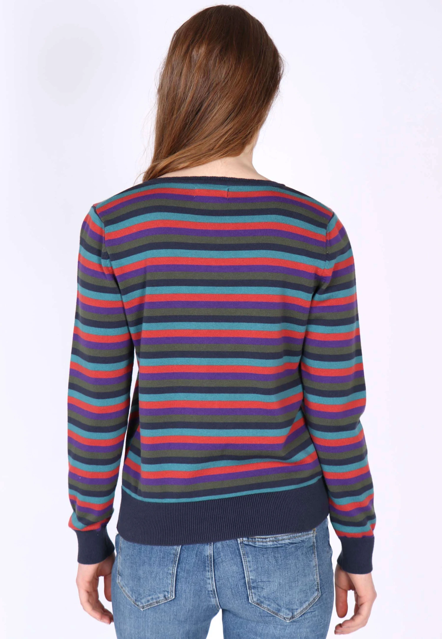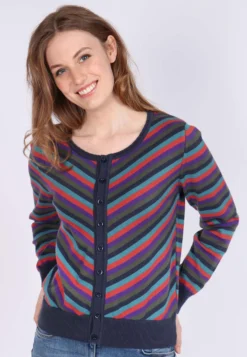 Gesamtlänge 58 cm bei Größe M. Diese Rundhals-Strickjacke, mit breiten Ripp-Bündchen an Ärmel und Saum, ist mit dem bunt gestreiften Muster ein echter Farbtupfer. Der Style Malou kann super zu unseren Kleidern und Röcken kombiniert werden. Aber auch einfach nur zur Jeans getragen, rundet sie den sportlich-lässigen Look ab. Durch die verwendete Bio-Baumwolle ist sie sehr angenehm zu tragen.