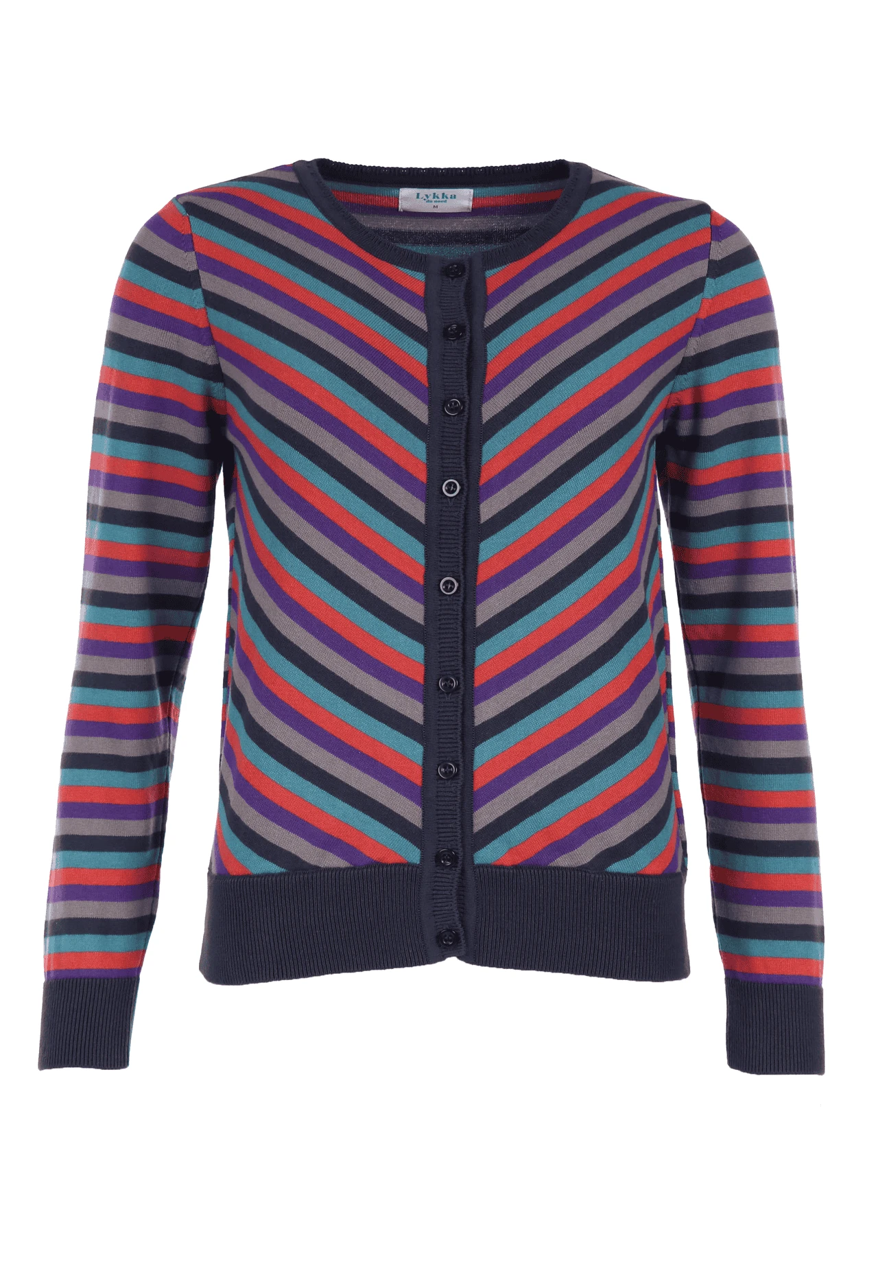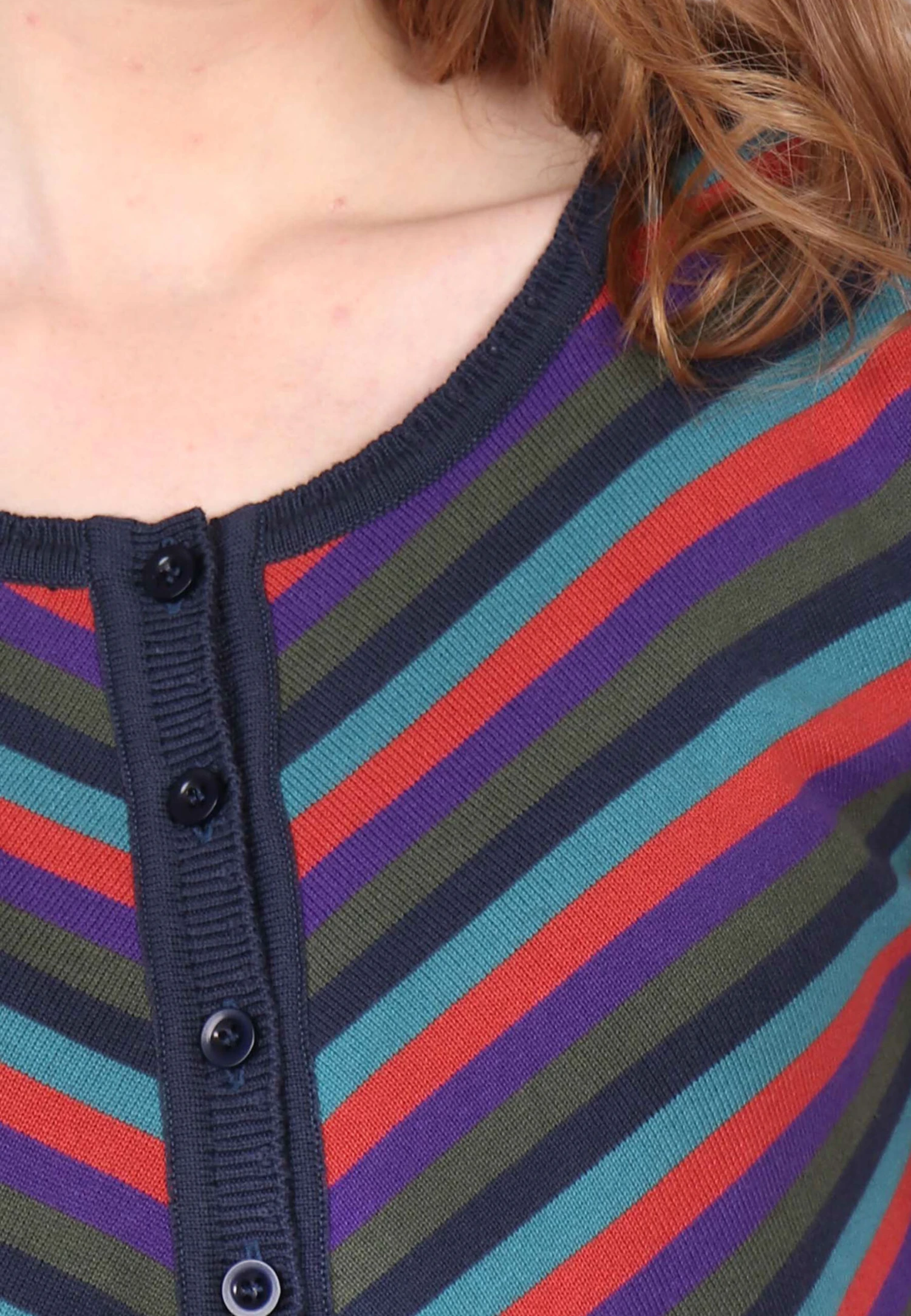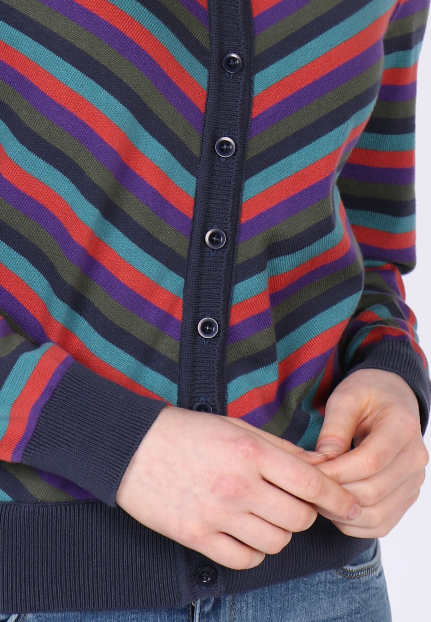 Gesamtlänge 58 cm bei Größe M. Diese Rundhals-Strickjacke, mit breiten Ripp-Bündchen an Ärmel und Saum, ist mit dem bunt gestreiften Muster ein echter Farbtupfer. Der Style Malou kann super zu unseren Kleidern und Röcken kombiniert werden. Aber auch einfach nur zur Jeans getragen, rundet sie den sportlich-lässigen Look ab. Durch die verwendete Bio-Baumwolle ist sie sehr angenehm zu tragen.