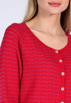 Gesamtlänge 58 cm bei Größe M. Diese Rundhals-Strickjacke mit breiten Ripp-Bündchen an Ärmel und Saum, ist mit seinem 2-farbigen, gestreiften Lochmuster ein echter Farbtupfer. Der Style Patie kann super zu unseren Kleidern und Röcken kombiniert werden. Aber auch einfach nur zur Jeans getragen, rundet dieser Cardigan den sportlich-lässigen Look ab. Durch die verwendete Bio-Baumwolle ist sie sehr angenehm zu tragen.