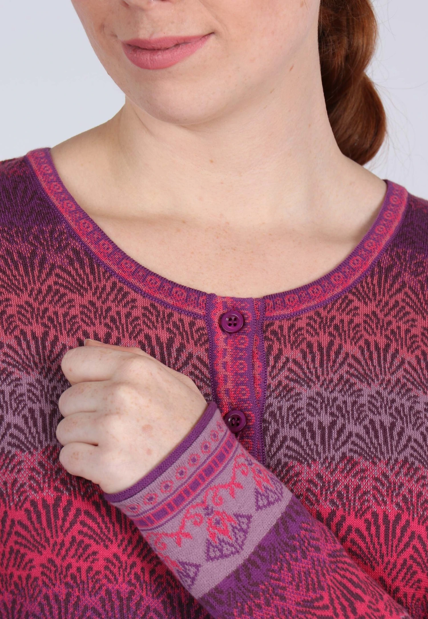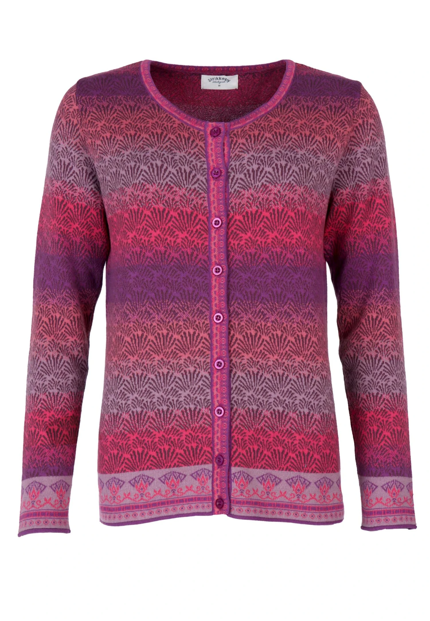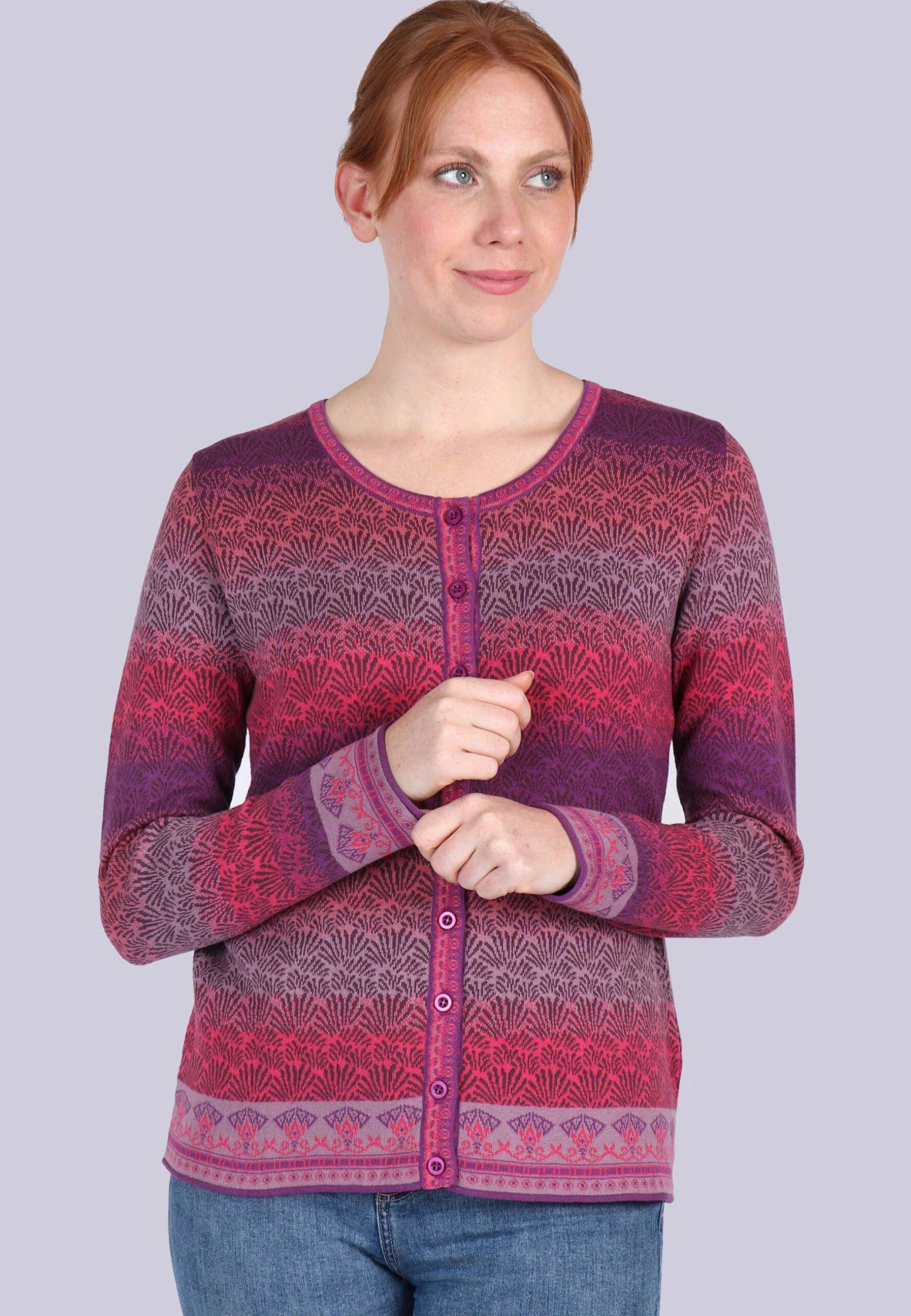 Länge bei Gr. M 62cm. Klassischer Rundhals Cardigan mit aufwendigem Jacquard-Muster. Der bunte Farbverlauf mit Mustermix machen RENEE peacock zu einem echten Lieblingsstück. Zusätzlich sorgt die wunderbar softe Qualität aus organic Cotton für einen angenehmen Tragekomfort.