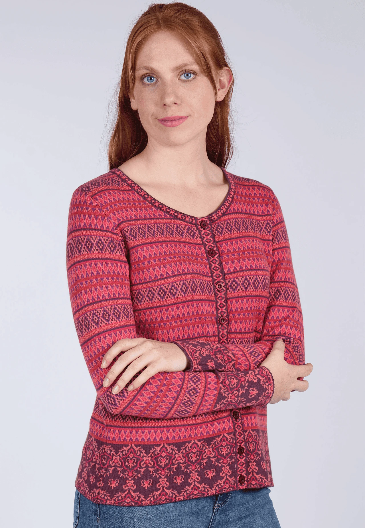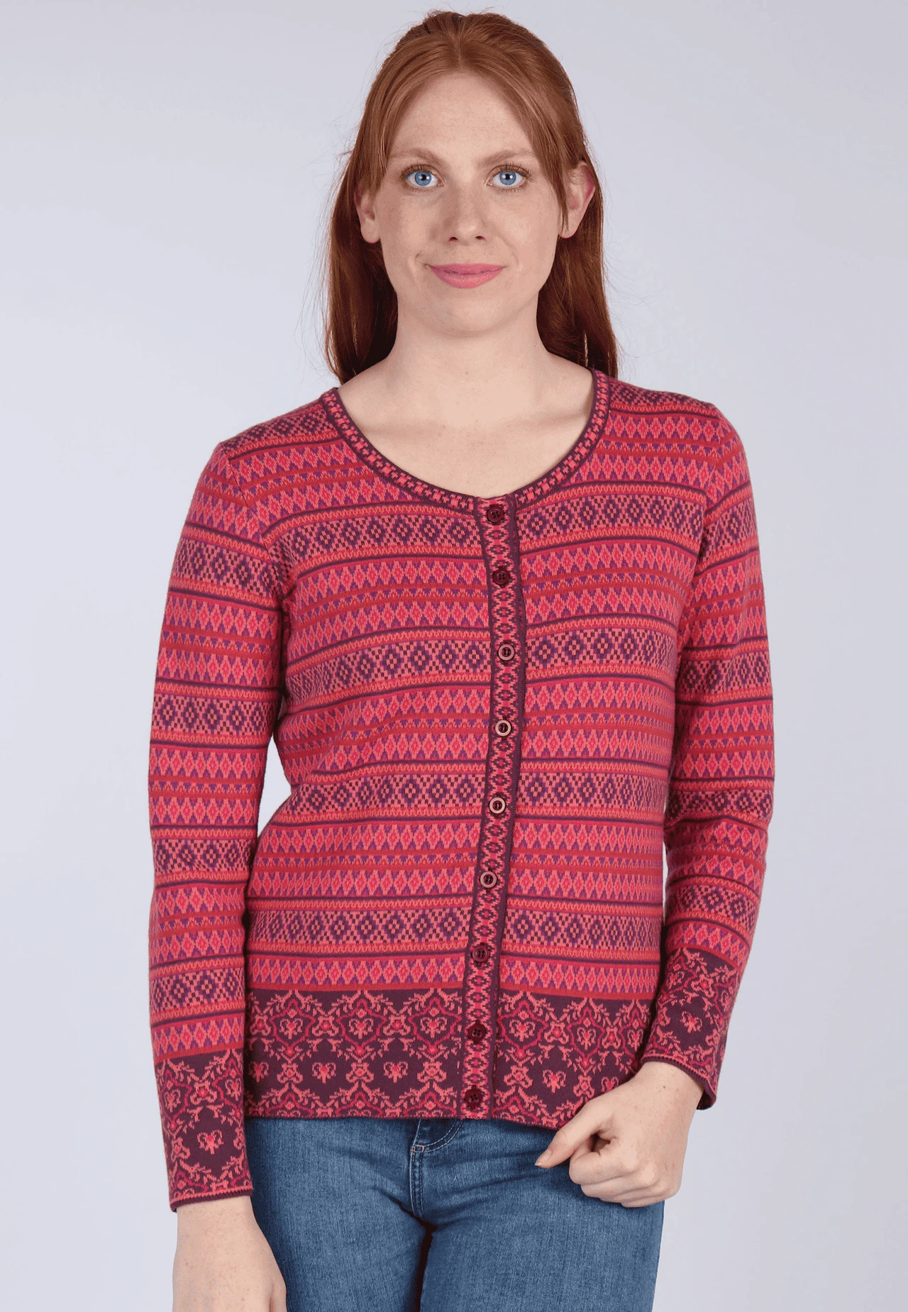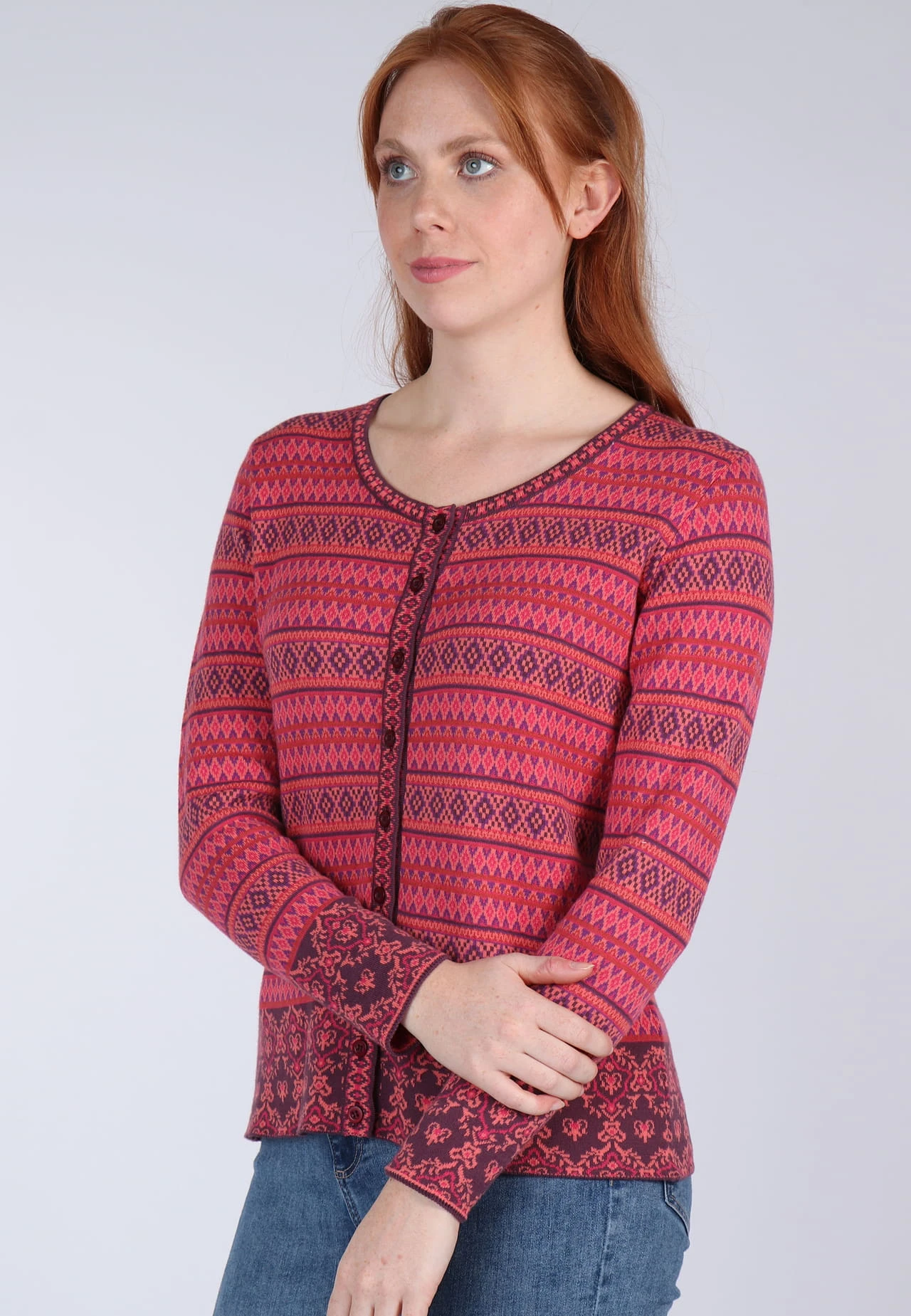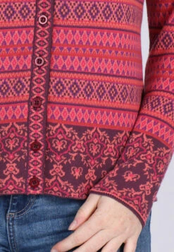 Länge bei Gr. M 62cm. Klassischer Rundhals Cardigan mit aufwendigem Jacquard-Muster. Der edle Mustermix machen RENEE royal zu einem echten Lieblingsstück. Zusätzlich sorgt die wunderbar softe Qualität aus organic Cotton für einen angenehmen Tragekomfort.
