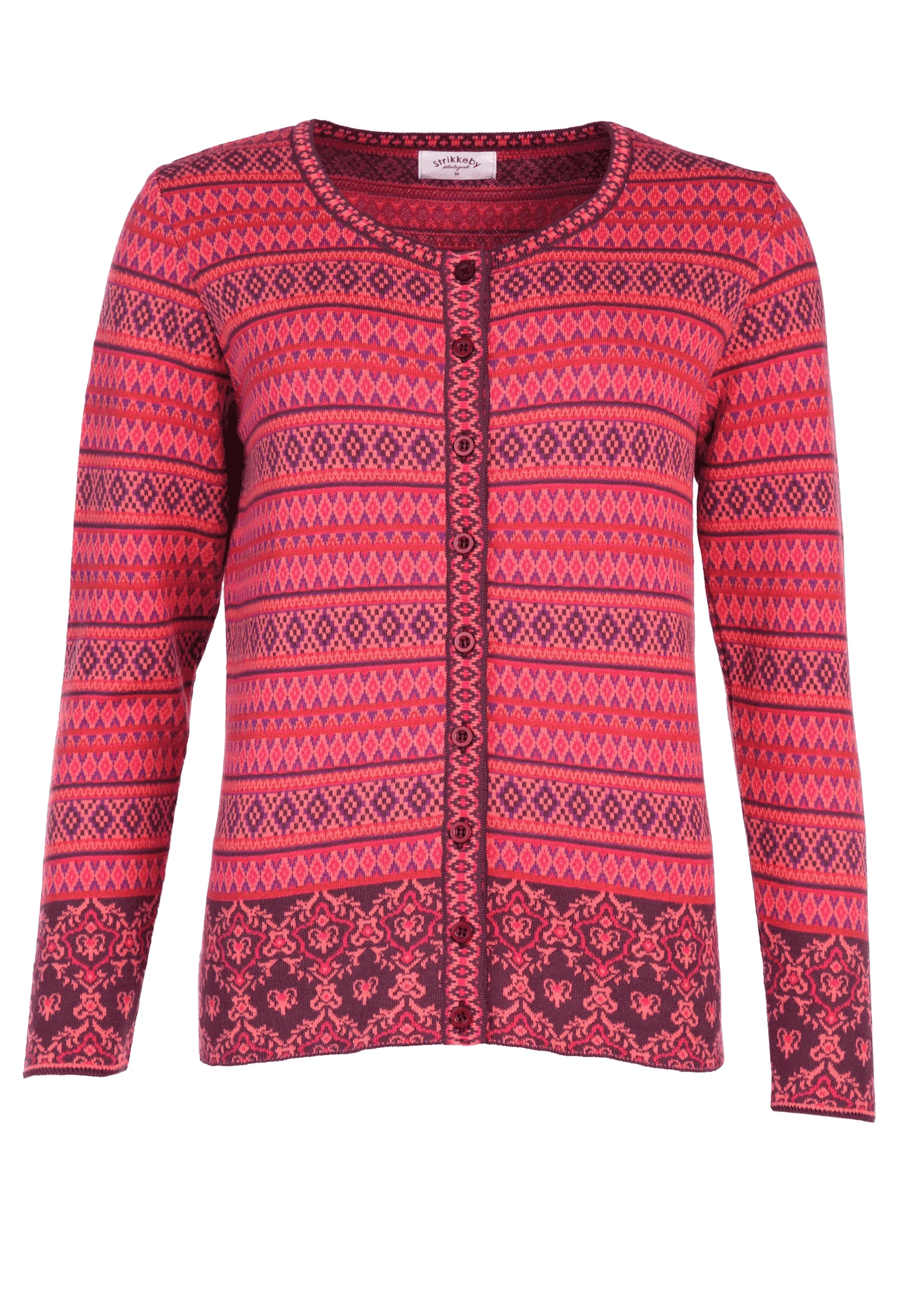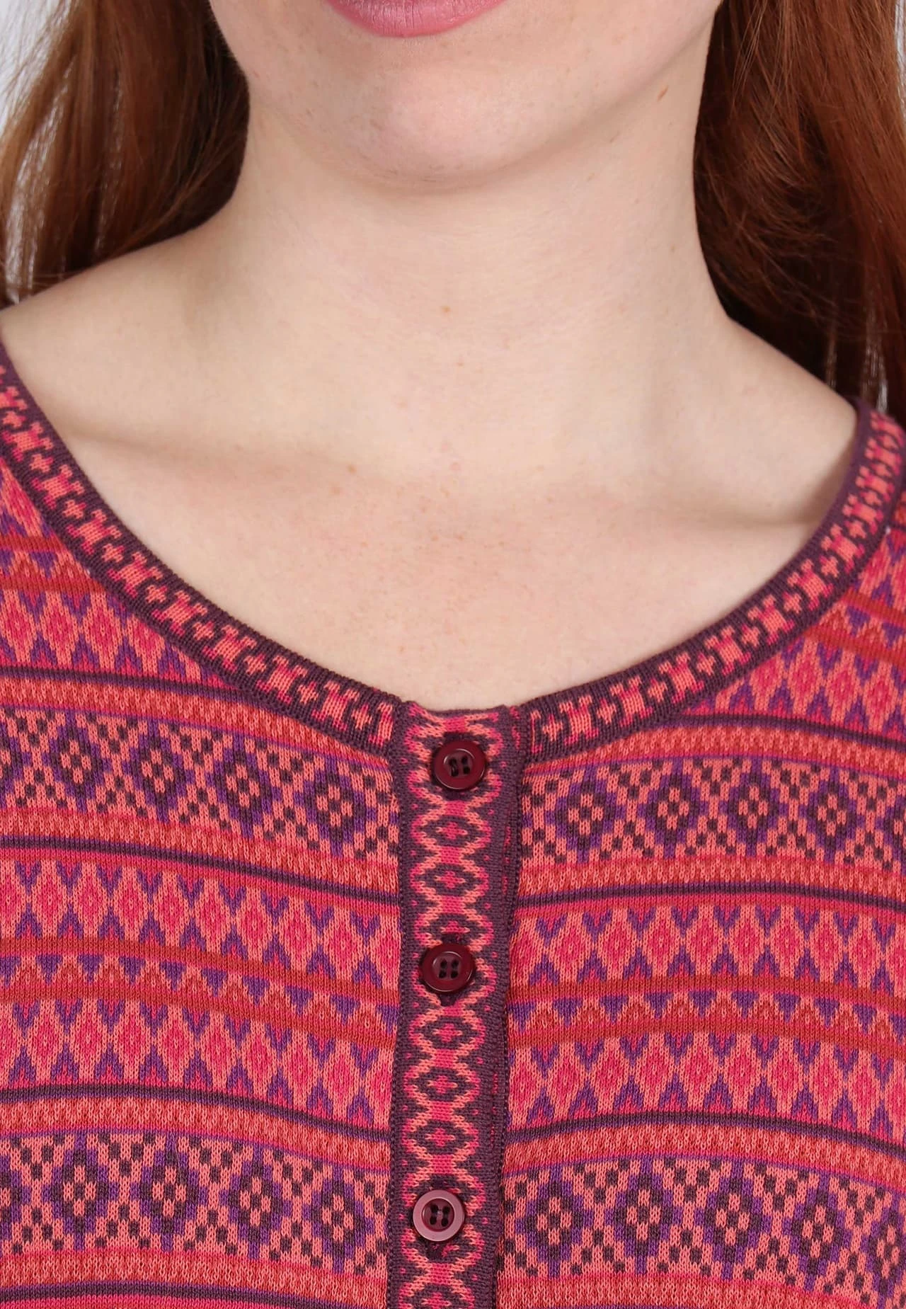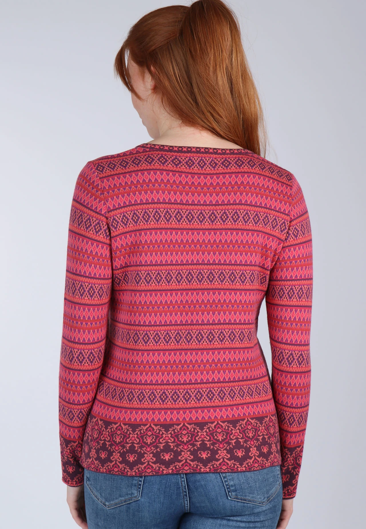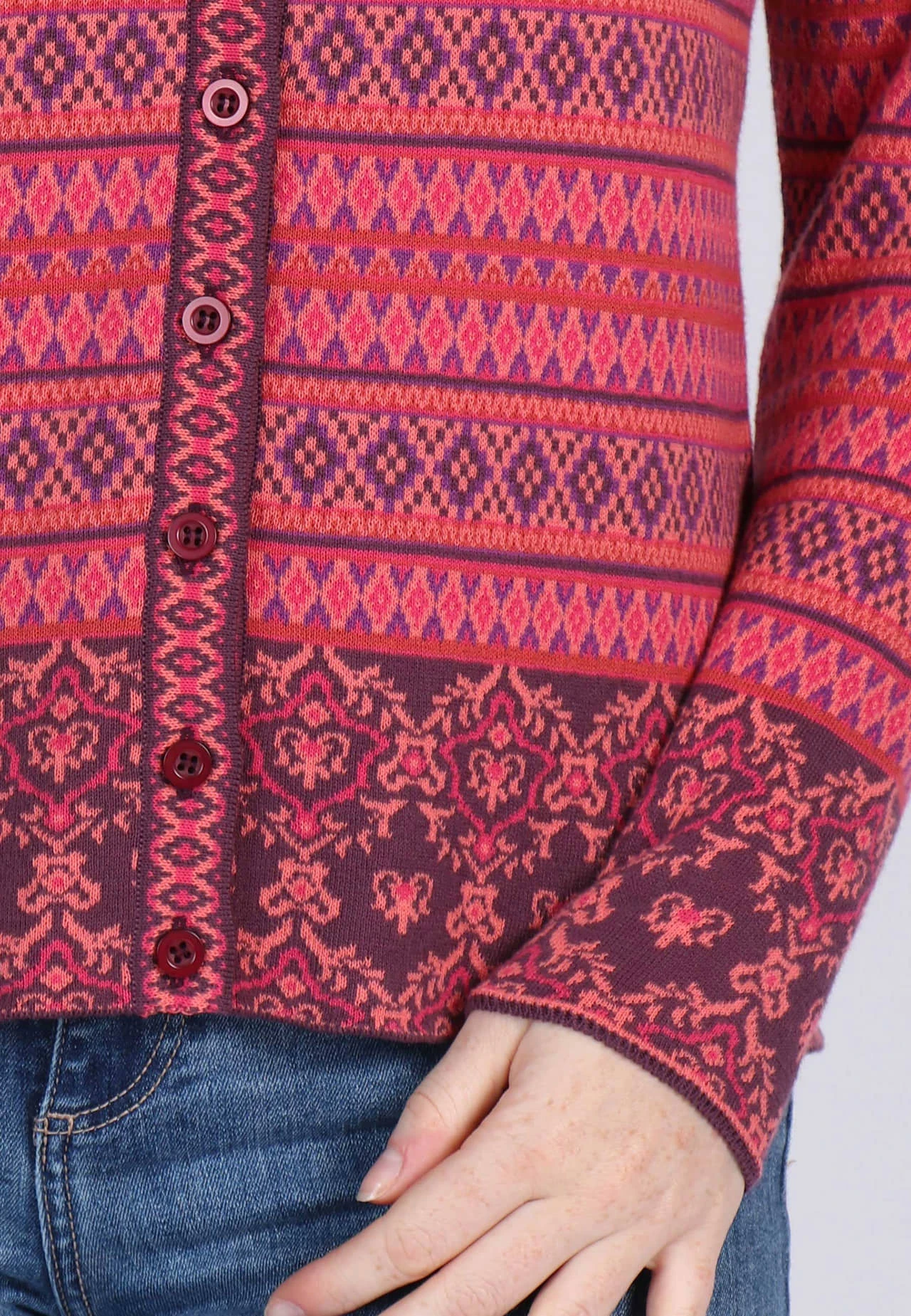 Länge bei Gr. M 62cm. Klassischer Rundhals Cardigan mit aufwendigem Jacquard-Muster. Der edle Mustermix machen RENEE royal zu einem echten Lieblingsstück. Zusätzlich sorgt die wunderbar softe Qualität aus organic Cotton für einen angenehmen Tragekomfort.