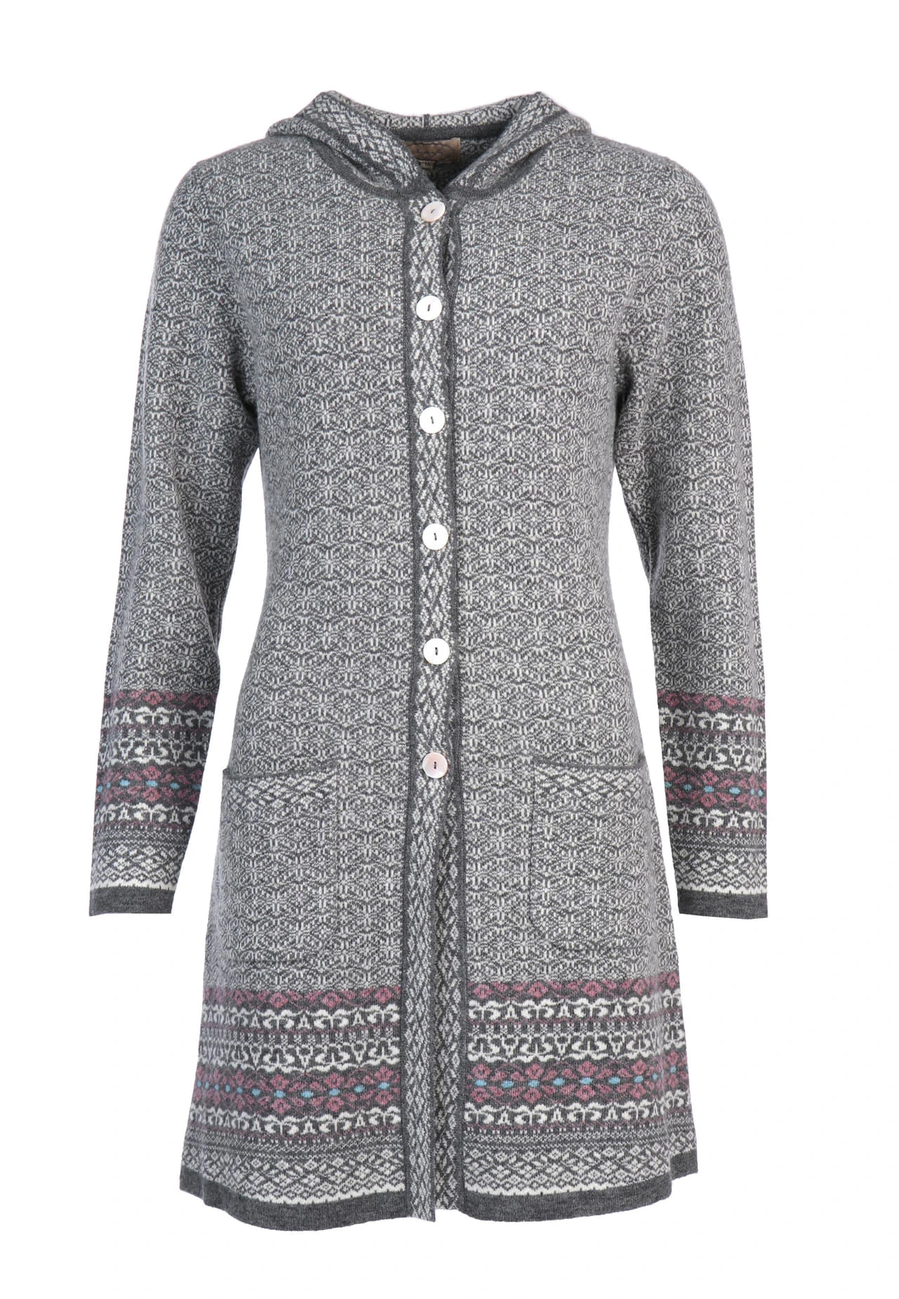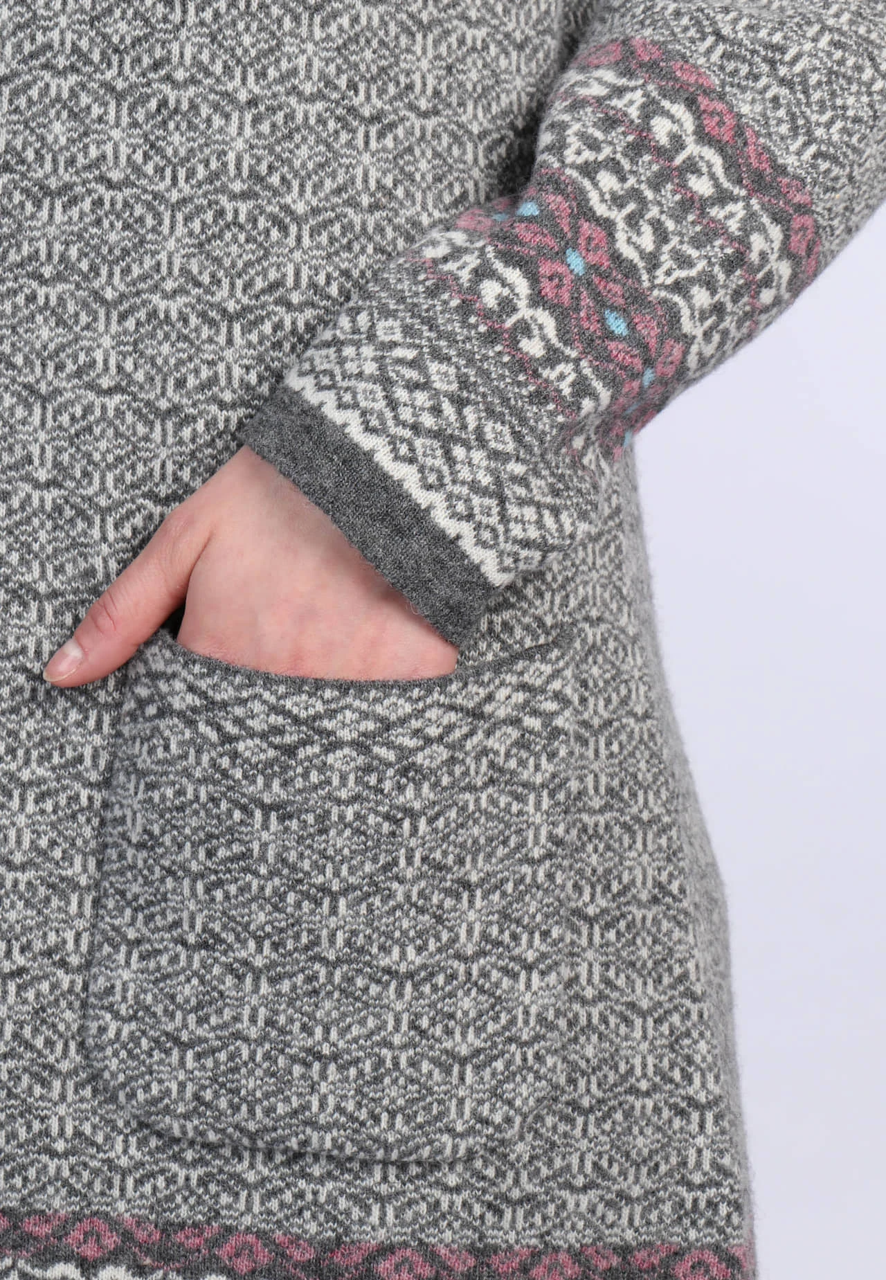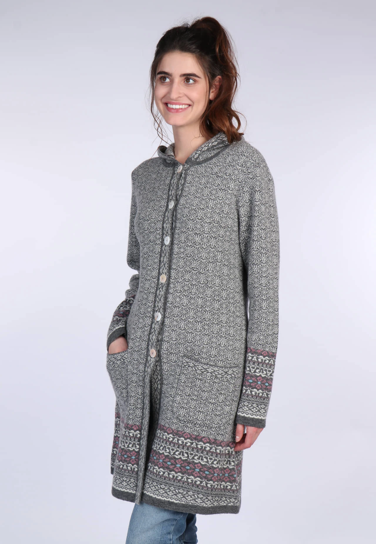 Gesamtlänge 88 cm bei Größe M. Kuschelig warm und weich durch den Winter bringt Sie unser Mantel Ann. Ein toller Allrounder für jeden Tag. Typisch nordische Muster zieren die Säume und sorgen für eine tolle Optik.