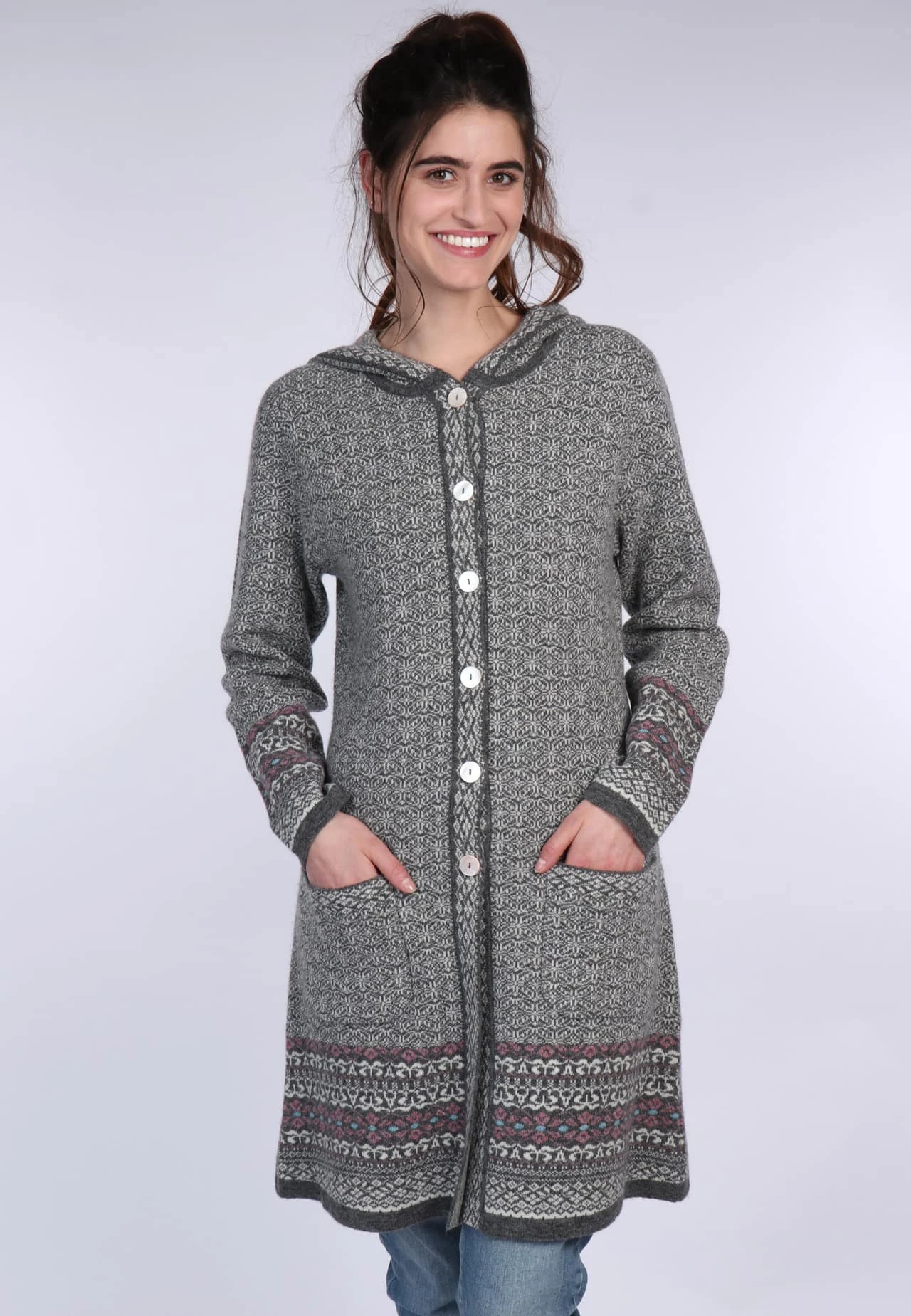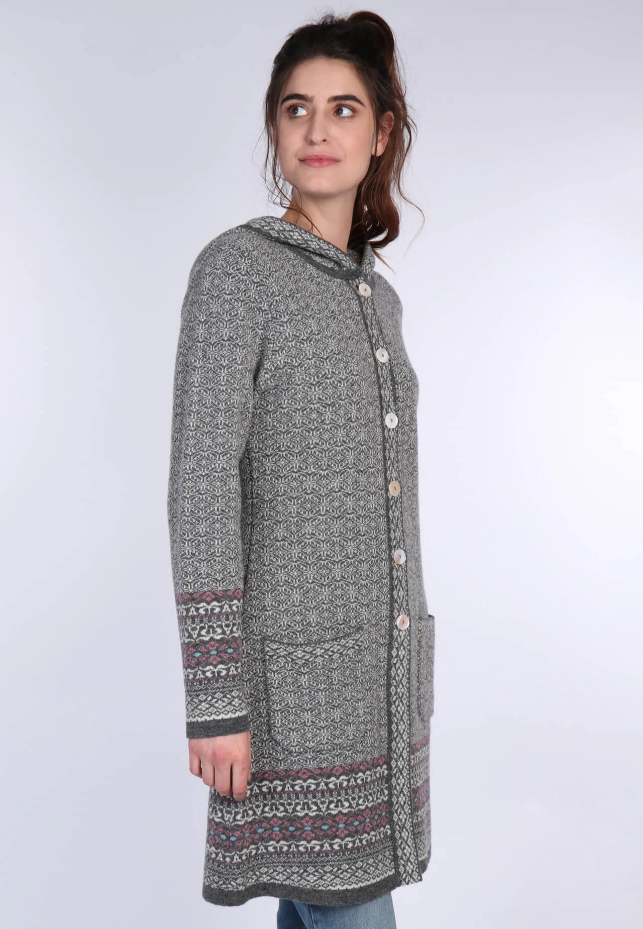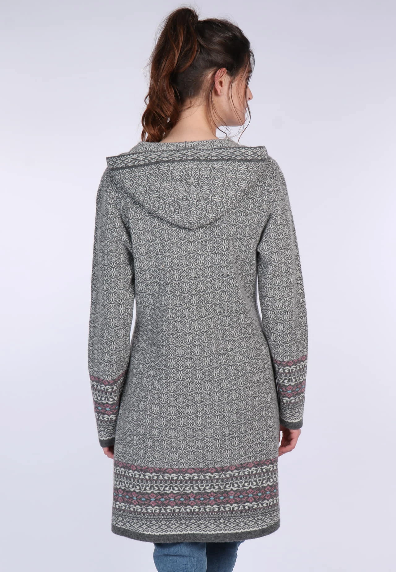 Gesamtlänge 88 cm bei Größe M. Kuschelig warm und weich durch den Winter bringt Sie unser Mantel Ann. Ein toller Allrounder für jeden Tag. Typisch nordische Muster zieren die Säume und sorgen für eine tolle Optik.