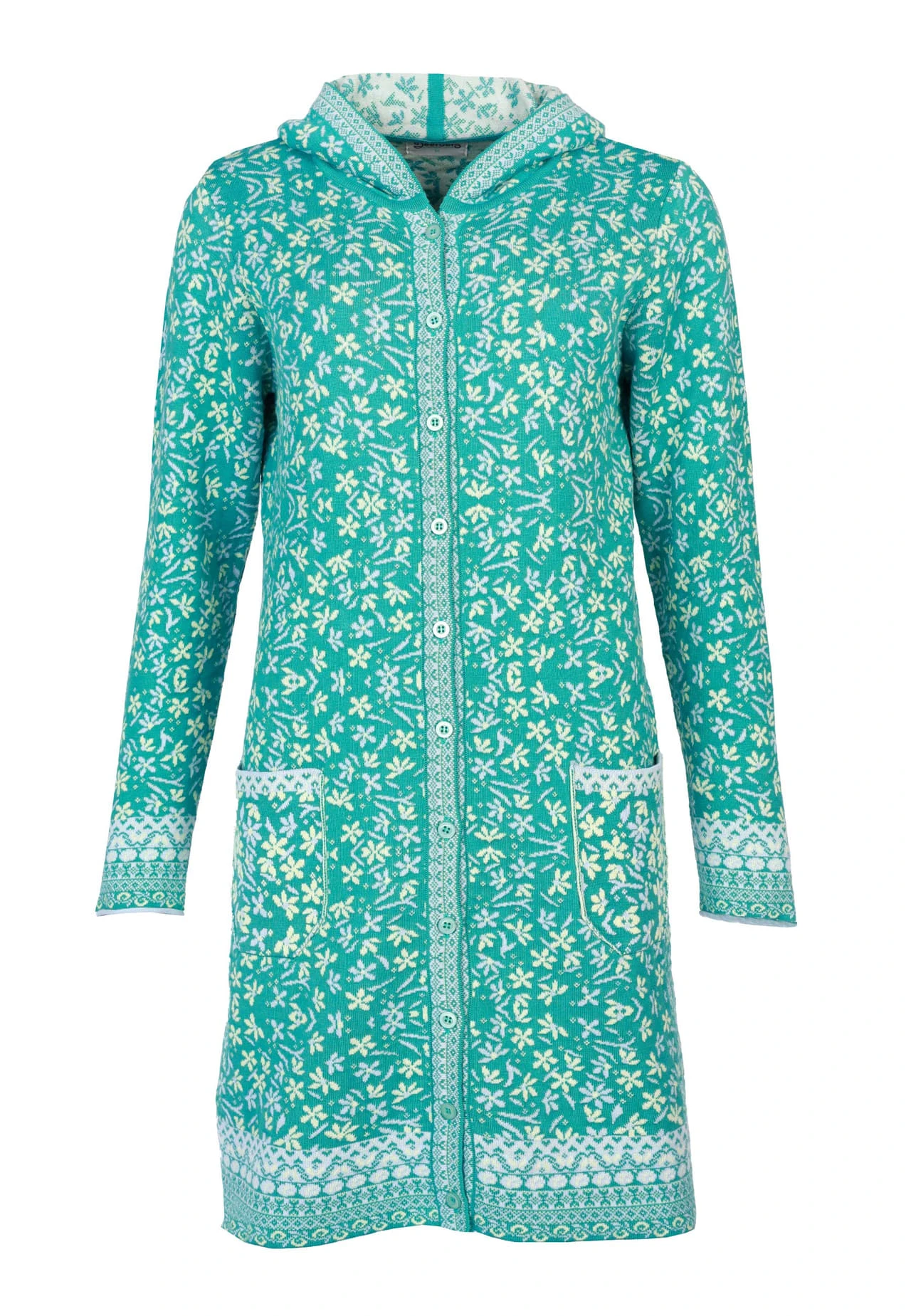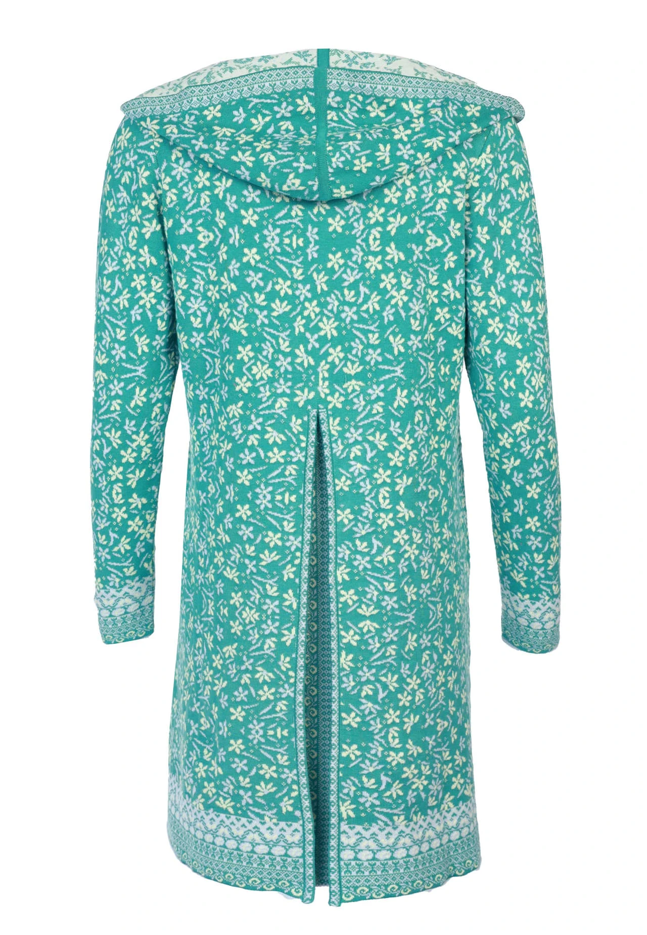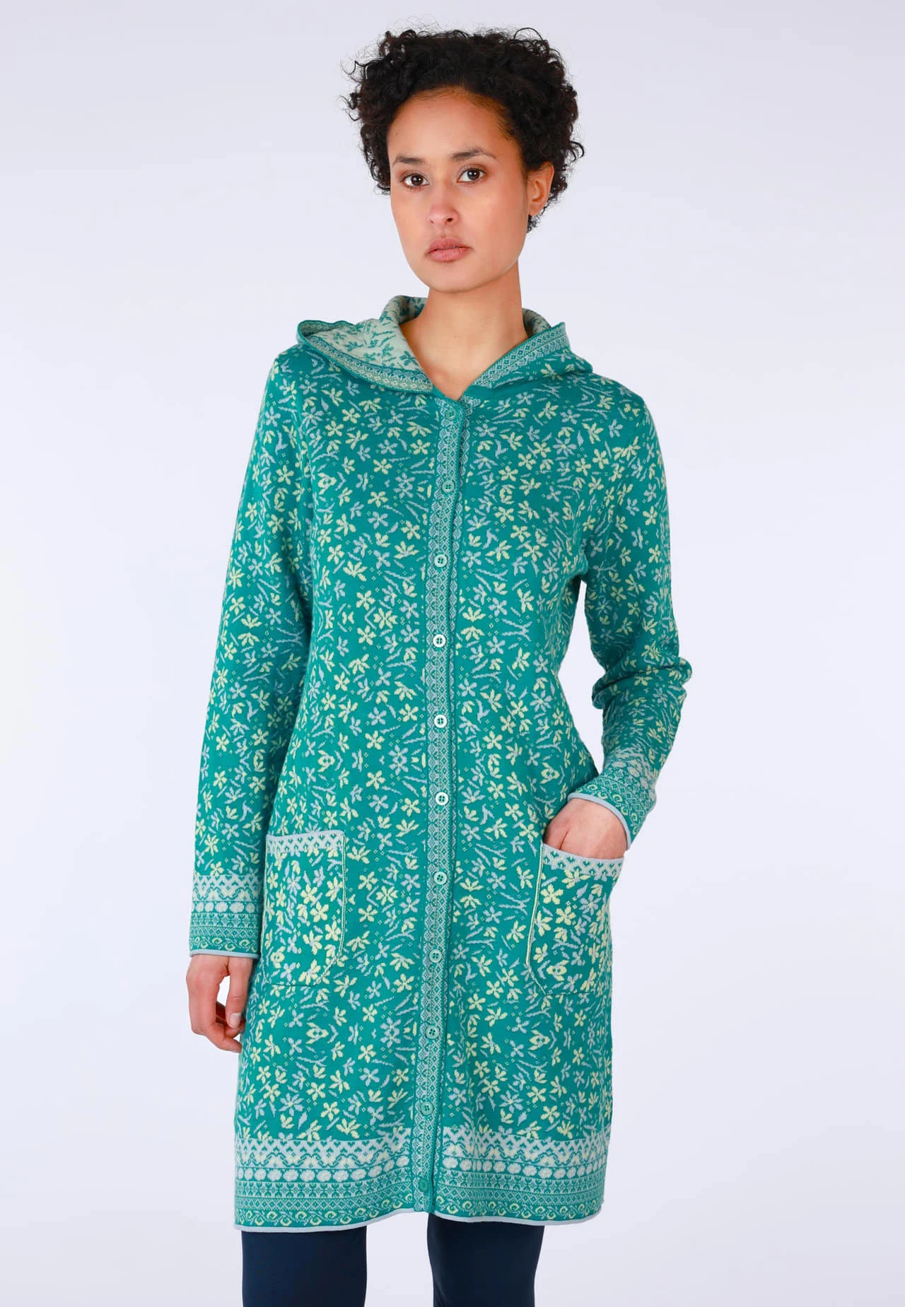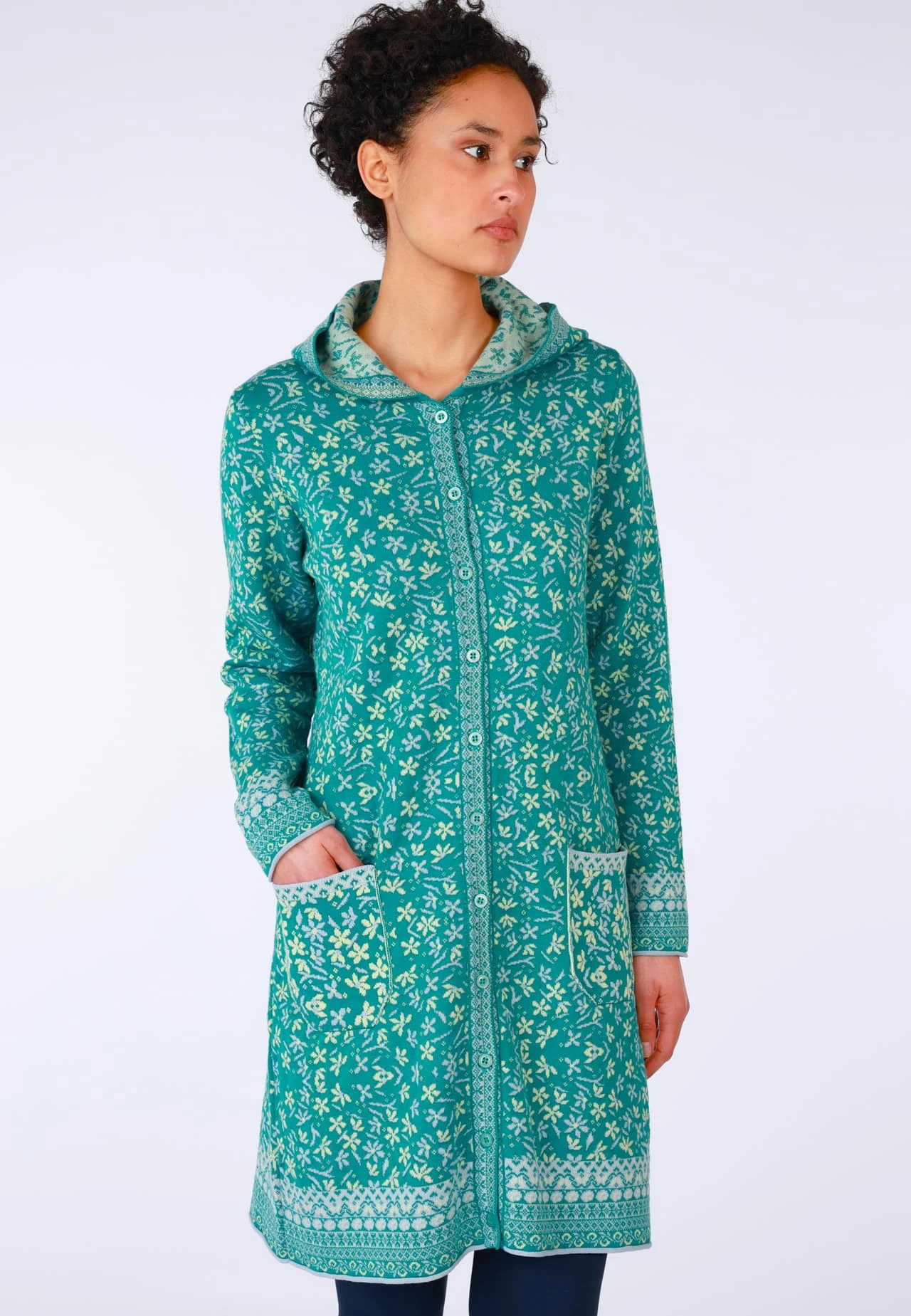 Länge 90 cm (M). Unser Strickmantel BRITTA kommt mit buntem millefleurs Muster und einem femininen Schnitt. Ein zusätzliches Highlight ist die aufwendig gearbeitete Kellerfalte im Rücken. Er ist ein toller Begleiter für jeden Tag. Aus 100% Bio-Baumwolle gefertigt sorgt er zusätzlich für einen angenehmen Tragekomfort.