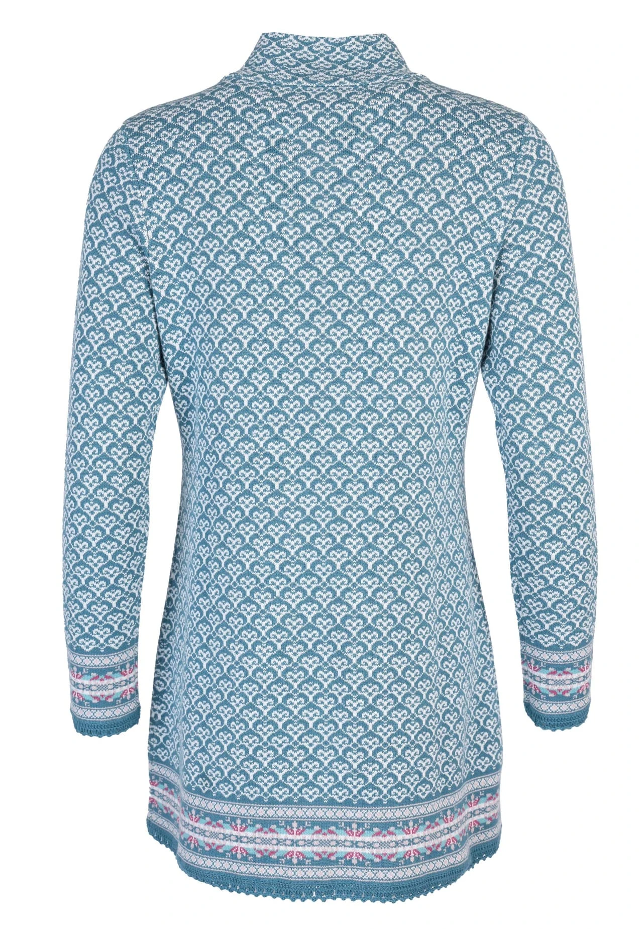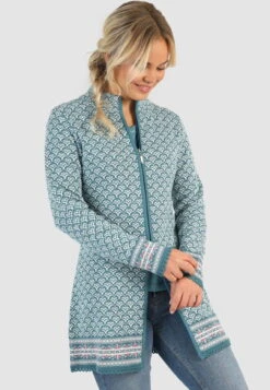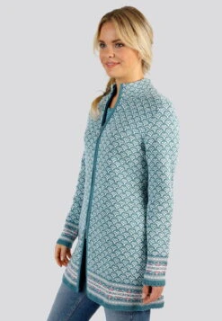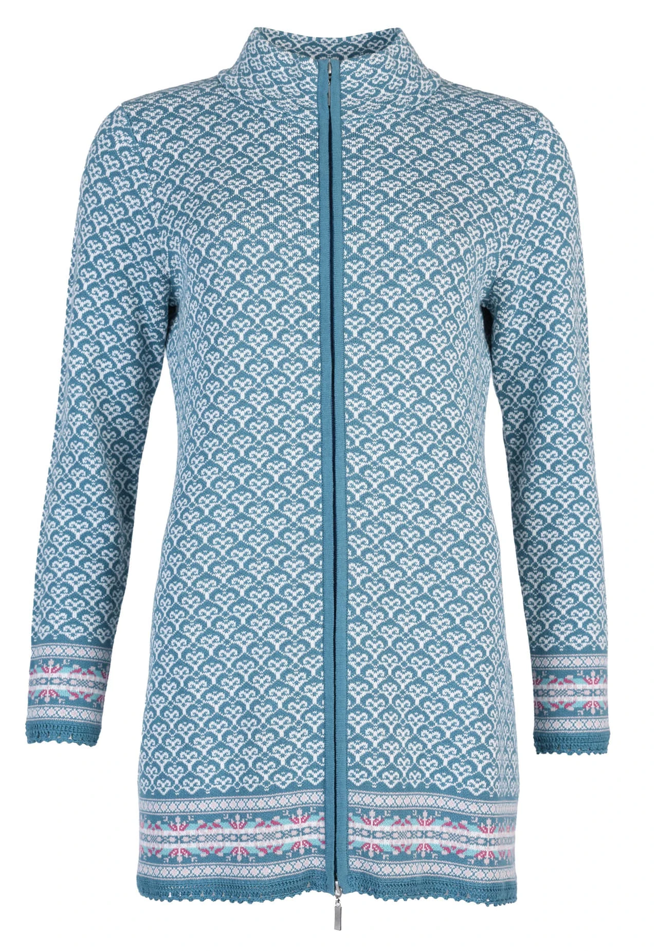 Länge 79cm (M). Der JADE Long-Cardigan aus Jacquard-Strick mit nordischem Muster ist aus 100% Baumwolle gefertigt und ein toller Begleiter für jeden Tag. Die farblich abgesetzte Borte und der Stehkragen sorgen für Eleganz und verleihen ein Hauch Scandinavian-Feeling.