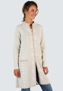 Länge 88 cm (M). Dieser schöne Strickmantel setzt verschiedene Jacquardmuster in Kombination und wird dadurch zu einem einzigartigen Style. Die Kellerfalte ist ein besonderes Detail im Rücken. Die verwendete weiche Baumwolle und die hochwertige Verarbeitung machen diesen Strickmantel zum Lieblingsstück der Saison.