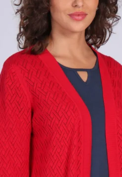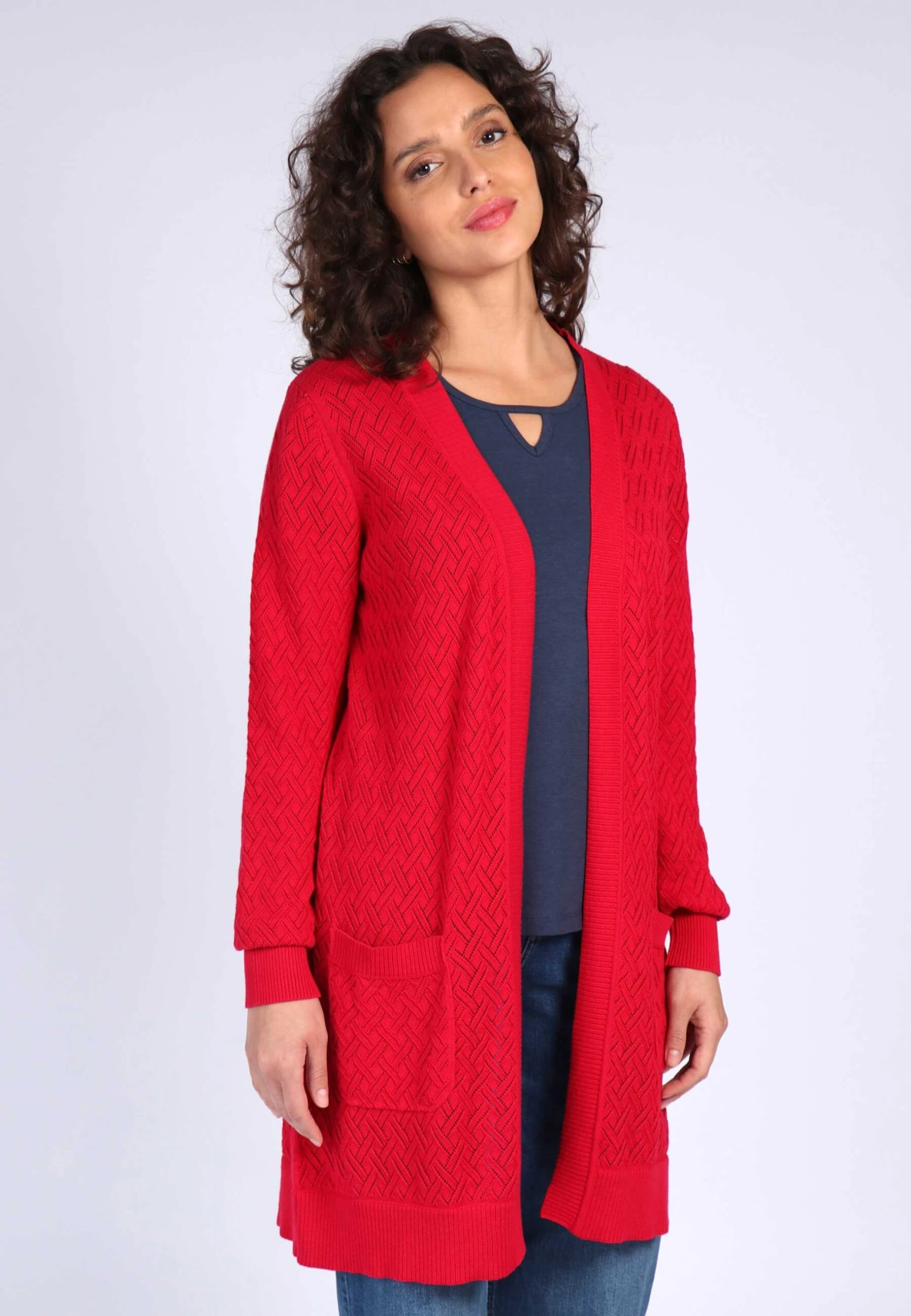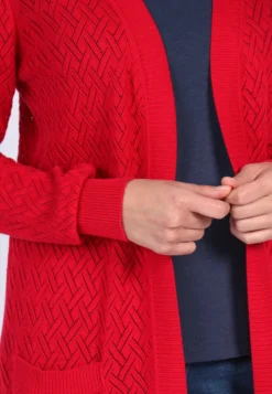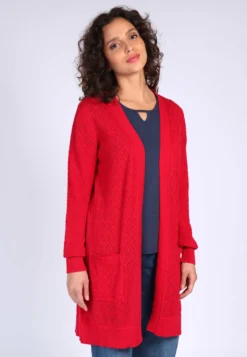 Gesamtlänge 84 cm bei Größe M. Dieser Strickmantel mit Retro-Muster ist eine gemütliche aber stylische Hülle. Die breiten Rippen-Bündchen sowie die aufgesetzten Taschen sind weitere praktische Details. Der Style Viola ist die perfekte Ergänzung zu Jeans, Kleidern und Röcken. Er ist ein echter Blickfang und untersteicht den lässig-femininen Look. Durch die verwendete Bio-Baumwolle ist dieser Strickmantel sehr angenehm zu tragen.