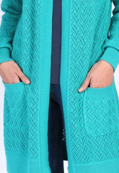 Gesamtlänge 84 cm bei Größe M. Dieser Strickmantel mit Retro-Muster ist eine gemütliche aber stylische Hülle. Die breiten Rippen-Bündchen sowie die aufgesetzten Taschen sind weitere praktische Details. Der Style Viola ist die perfekte Ergänzung zu Jeans, Kleidern und Röcken. Er ist ein echter Blickfang und untersteicht den lässig-femininen Look. Durch die verwendete Bio-Baumwolle ist dieser Strickmantel sehr angenehm zu tragen.