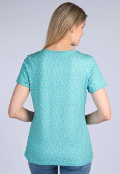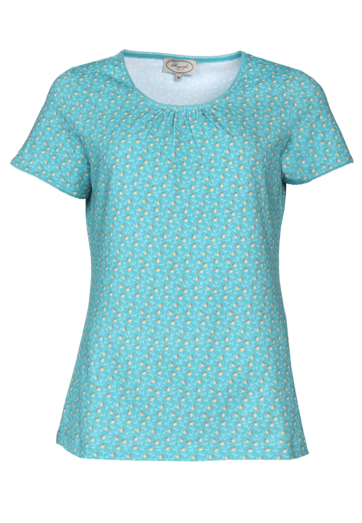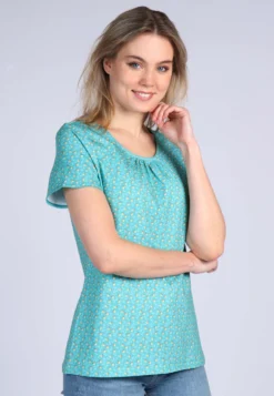 Unser T-Shirt Camille hat einen schönen Rundhals mit kleiner Drapierung am Ausschnitt und Spitzen-Detail und verleiht jedem Outfit einen femininen Look.