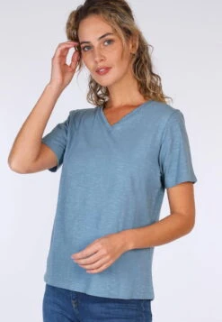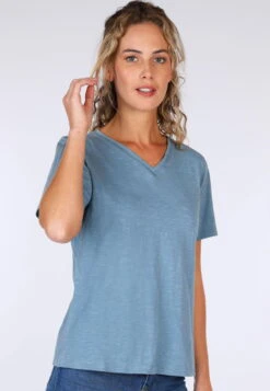 Länge 62cm (M). Der leicht gerundete V-Ausschnitt mit dekorativer Stickerei kreiert ein schönes Dekolleté und macht diese T-Shirt zu einem tollen und besonderem Basic.