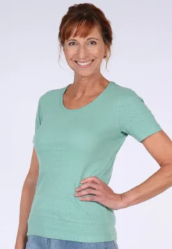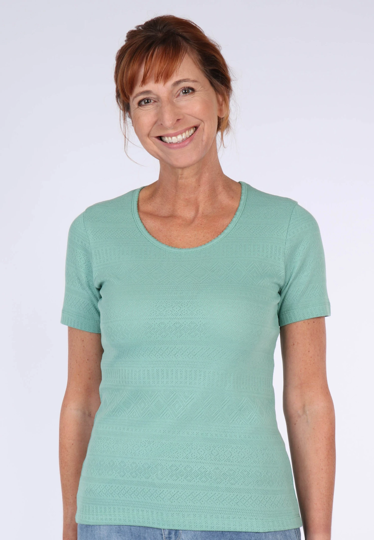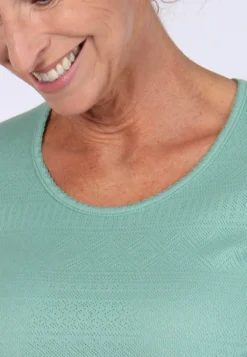 Mit zartem Ajour-Muster und aus hochwertiger und hautfreundlicher Baumwolle kommt unser Sorgenfri Klassiker Maren. Die kleine Muschelkante am Ausschnitt unterstreicht den sportiv romantischen Look.