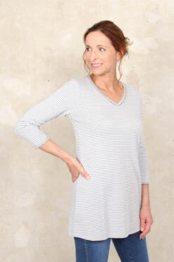 Gesamtlänge 76 cm bei Größe M, diese Tunika gefällt durch ihre Streifenoptik und ist durch die verwendete Baumwolle sehr angenehm zu tragen. Als schönes Detail fallen die Säume an den Ärmeln und am Ausschnitt auf.